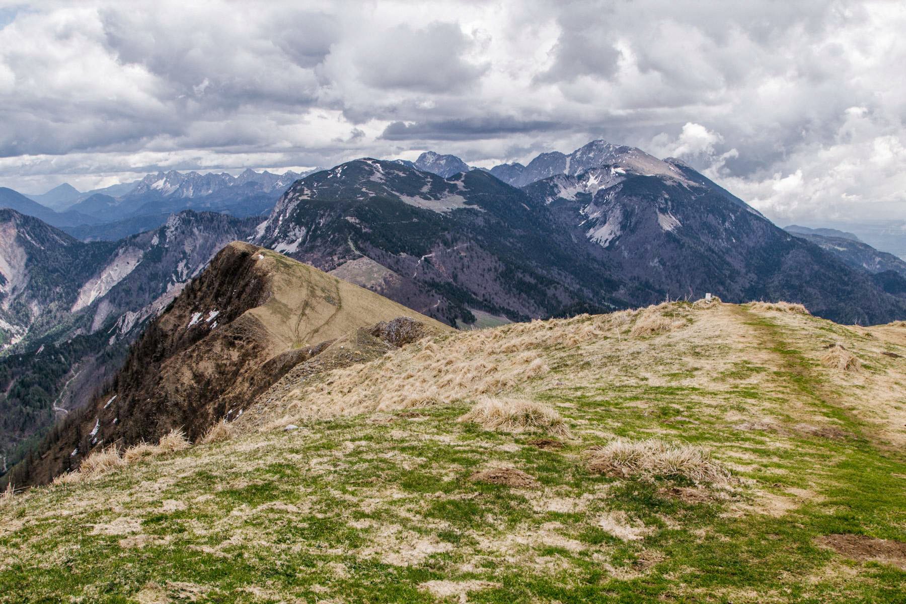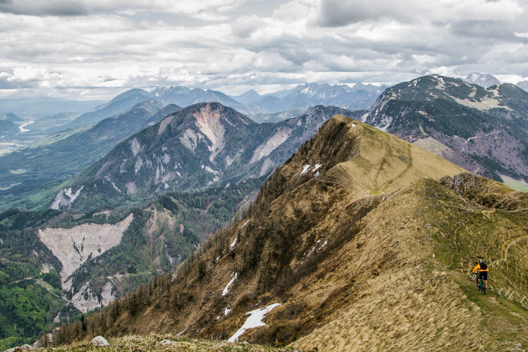 Im Frühling hat man auf der Südseite der Karawanken den Vorteil, dass die Sonne dem Schnee recht bald ein Ende setzt. So haben wir uns Mitte Mai auf gemacht die slowenische Seite wieder einmal etwas besser zu erkunden. Dies war zu Saisonanfang wieder eine Herausforderung, weil die Forststraßen teilweise abartig steil sind. Die letzten Höhenmeter zu unserem Gipfel erreichten wir nach rund einer Stunde Bike schieben und Tragen auf dem Grenzkamm zwischen Österreich und Slowenien bei durchgehend atemberaubender Aussicht. Die Strapazen haben sich vielfach ausgezahlt.