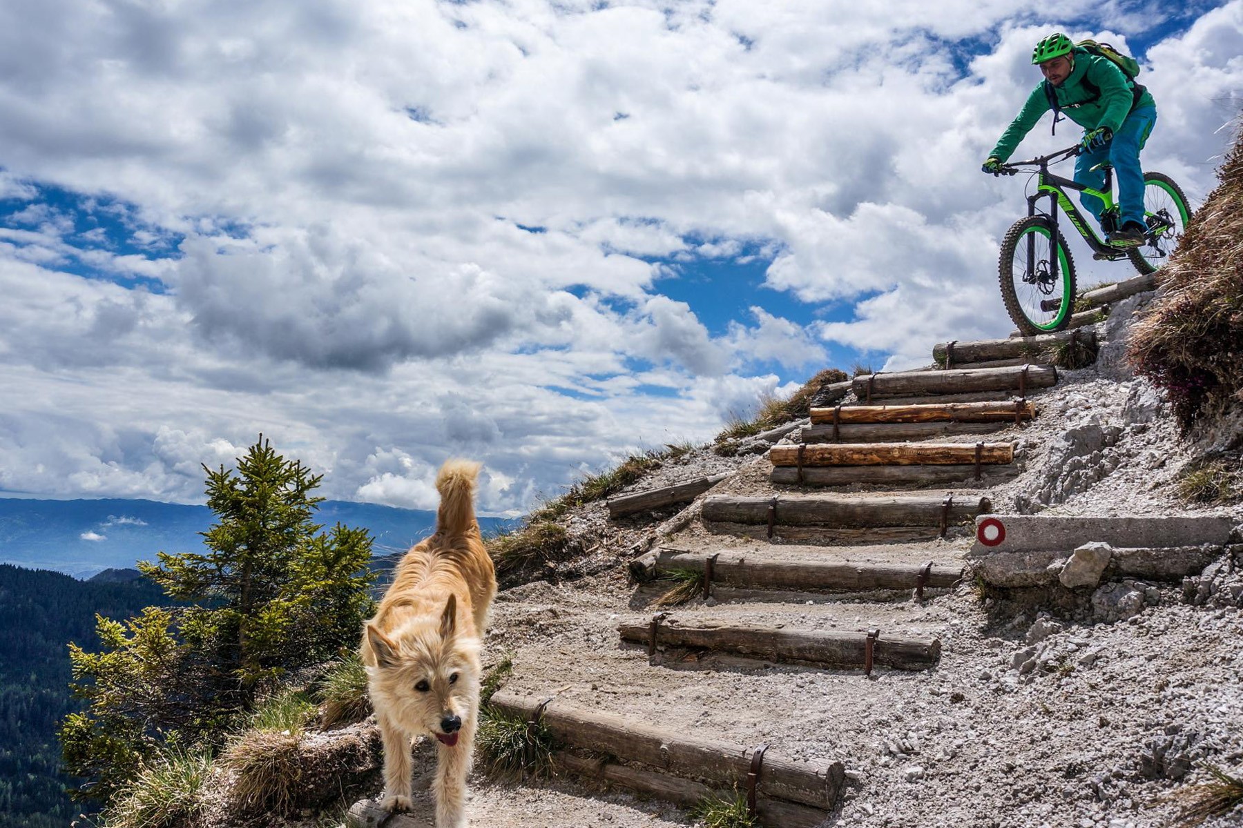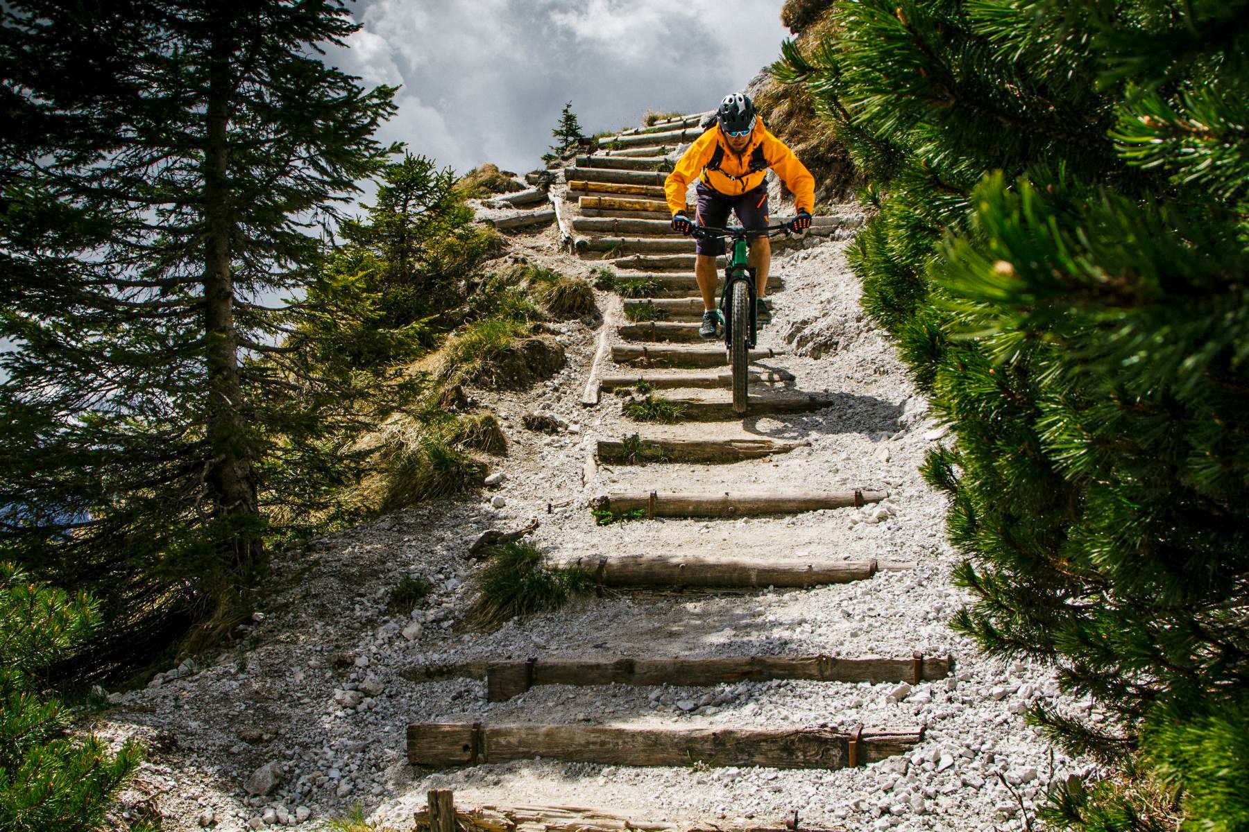 Bei unserer Abfahrt kreuzten wir eine bewirtschaftetet Berghütte und den Hüttenwirten am Trail. An diesem Tag hatte er sich der akribischen Wegpflege verschrieben und putzte den Weg zur Hütte fein säuberlich aus. Kein einziges Staubkorn oder Blatt war mehr zu sehen. Einfach unglaublich. Wir trauten uns gar nicht weiter zu fahren und suchten das Gespräch. Grinsend winkte er uns freundlich durch und wir genossen eine Stufe nach der anderen. Davon gab es nämlich mehr als genug. Die griffigen, trockenen Holzstufen bildeten mit natürlichen Felsformationen eine herrliche Spielwiese, die unsere Köpfe bei der elegantesten Linienwahl so richtig zum Rauchen brachten.