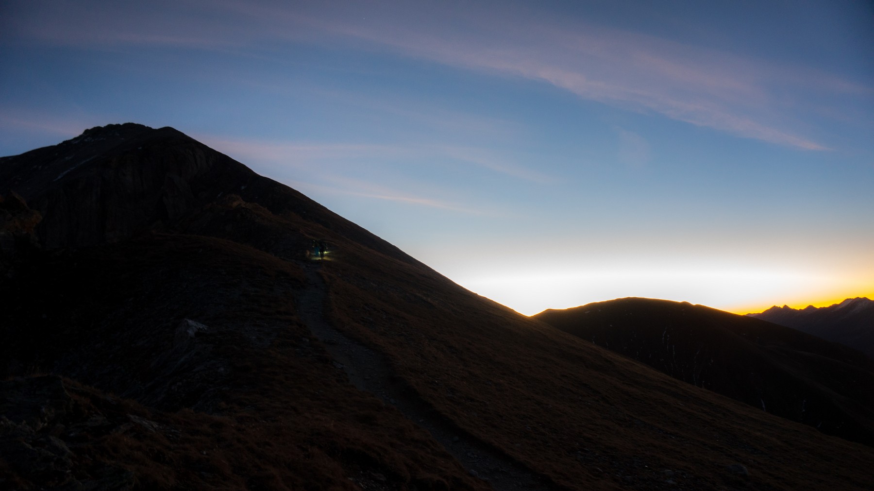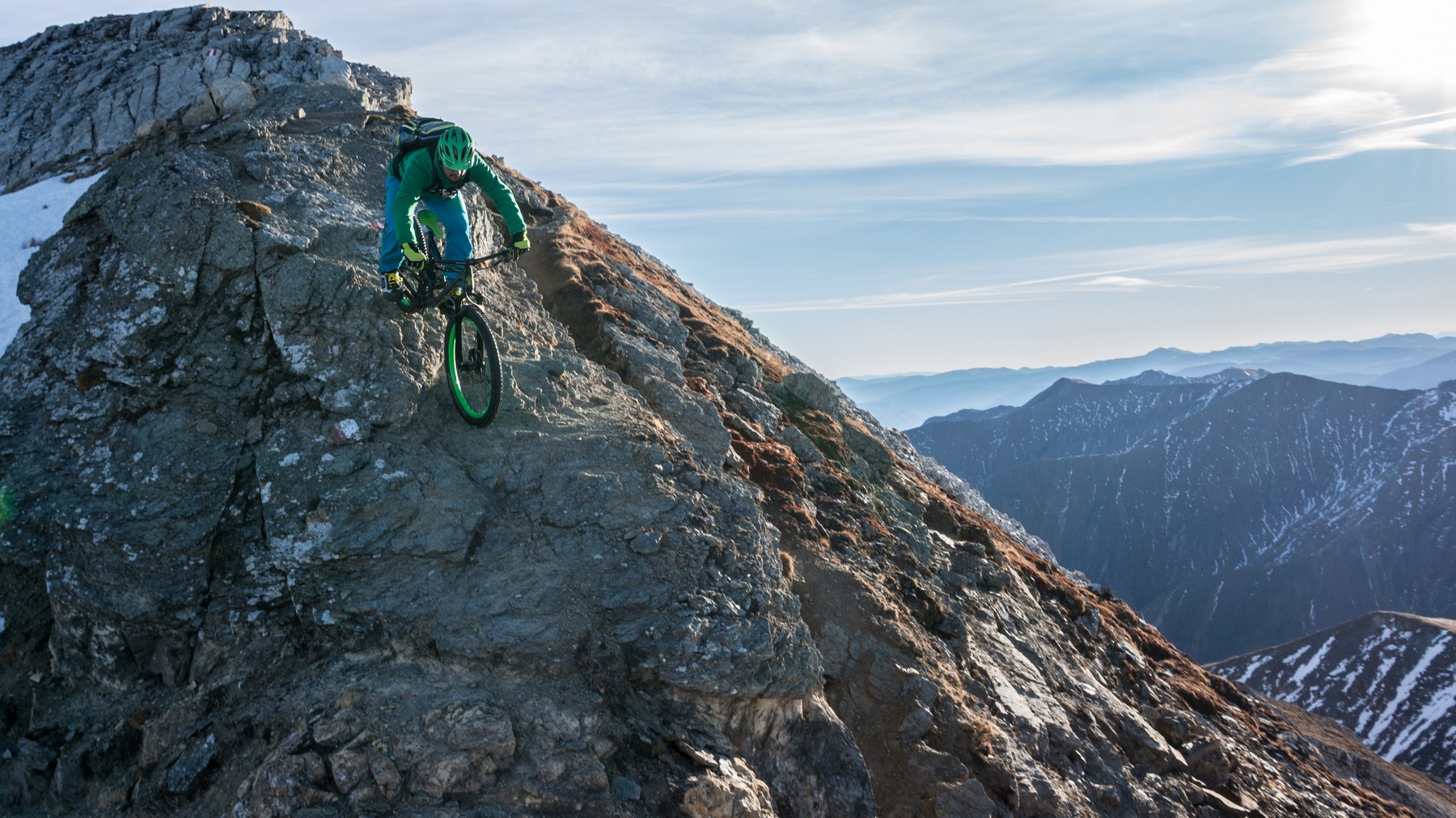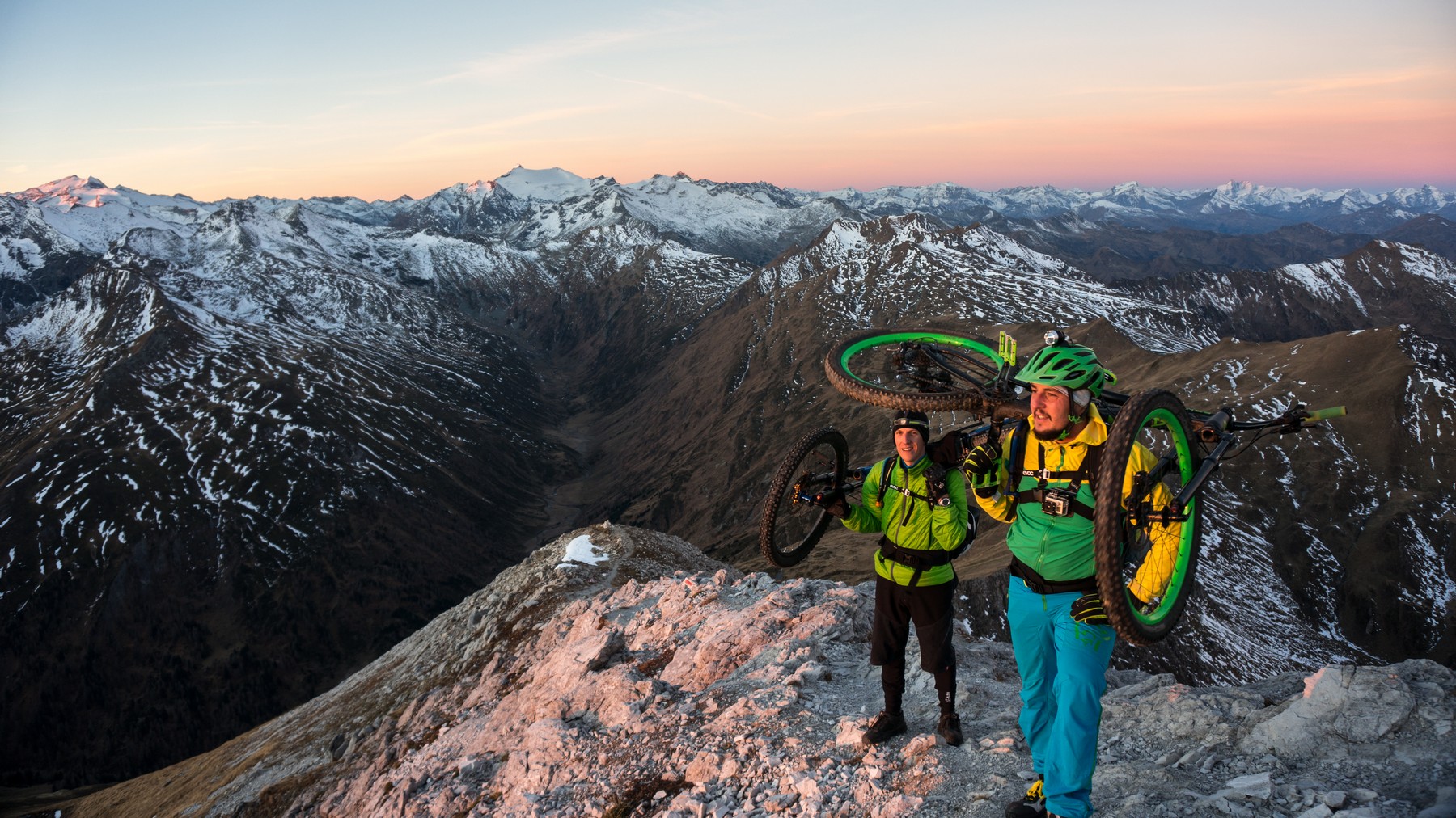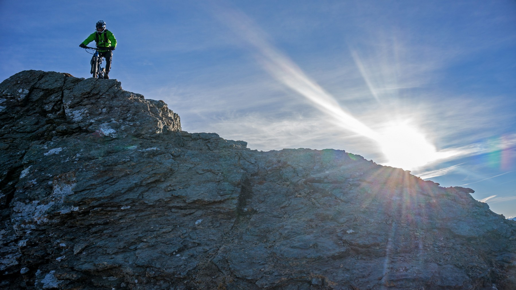 Noch ist es wirklich dunkel, auch der Horizont liefert noch keinen Hinweis auf die Sonne. Im Gegensatz zu gestern Abend wird kaum geratscht, denn wir brauchen die Energie. Langsam steigen wir auf, anfangs noch durch Wiesenhänge, die aber schon bald steindurchsetzter werden und schlussendlich einem alpinen, felsigen Grat weichen. Je heller es wird, umso ungläubiger werden die Blicke – das schaut nicht wirklich gut fahrbar aus, aber zumindest der Aufstieg macht Spaß. Gummisohlen auf Felsen: Mir gibt das etwas. Wir geben Gas, aber es wird immer klarer, dass wir heute nur Zweite am Gipfel sein werden, die Sonne ist schneller. Zum Glück, denn sie vertreibt die Kälte und tut vor allem den klammen Fingern gut. Sensationell, wie sie die Einsamkeit hier oben und das Bühnenbild um uns herum beleuchtet. Manche Gipfel sind schon angezuckert und leuchten jetzt rosa-orange, die Übrigen sind karg und strahlen tiefe Ruhe aus. Da ist nix mehr mit Speedbikebergsteigen. In diesem Szenario bewerkstelligen wir die letzten Meter und stehen dann ganz oben.