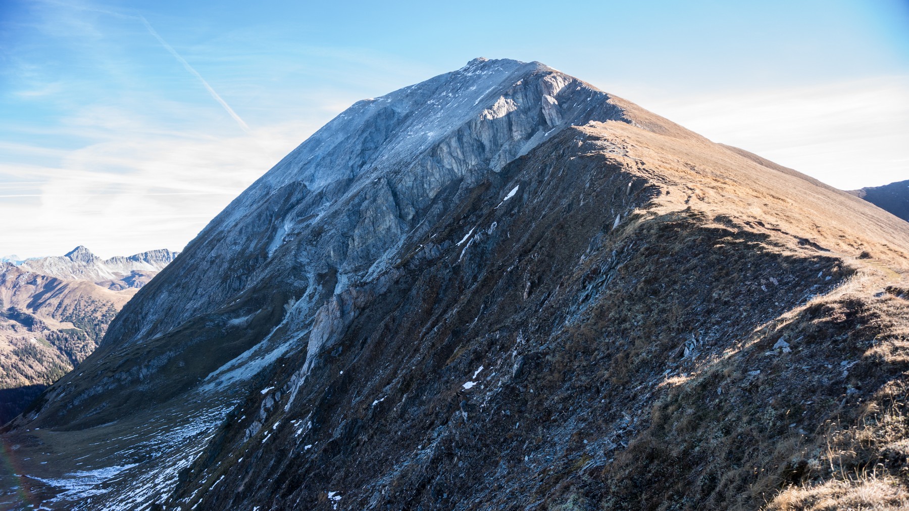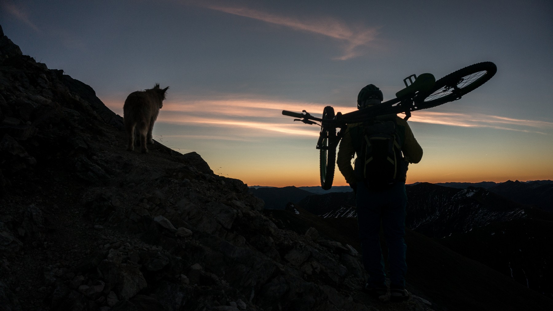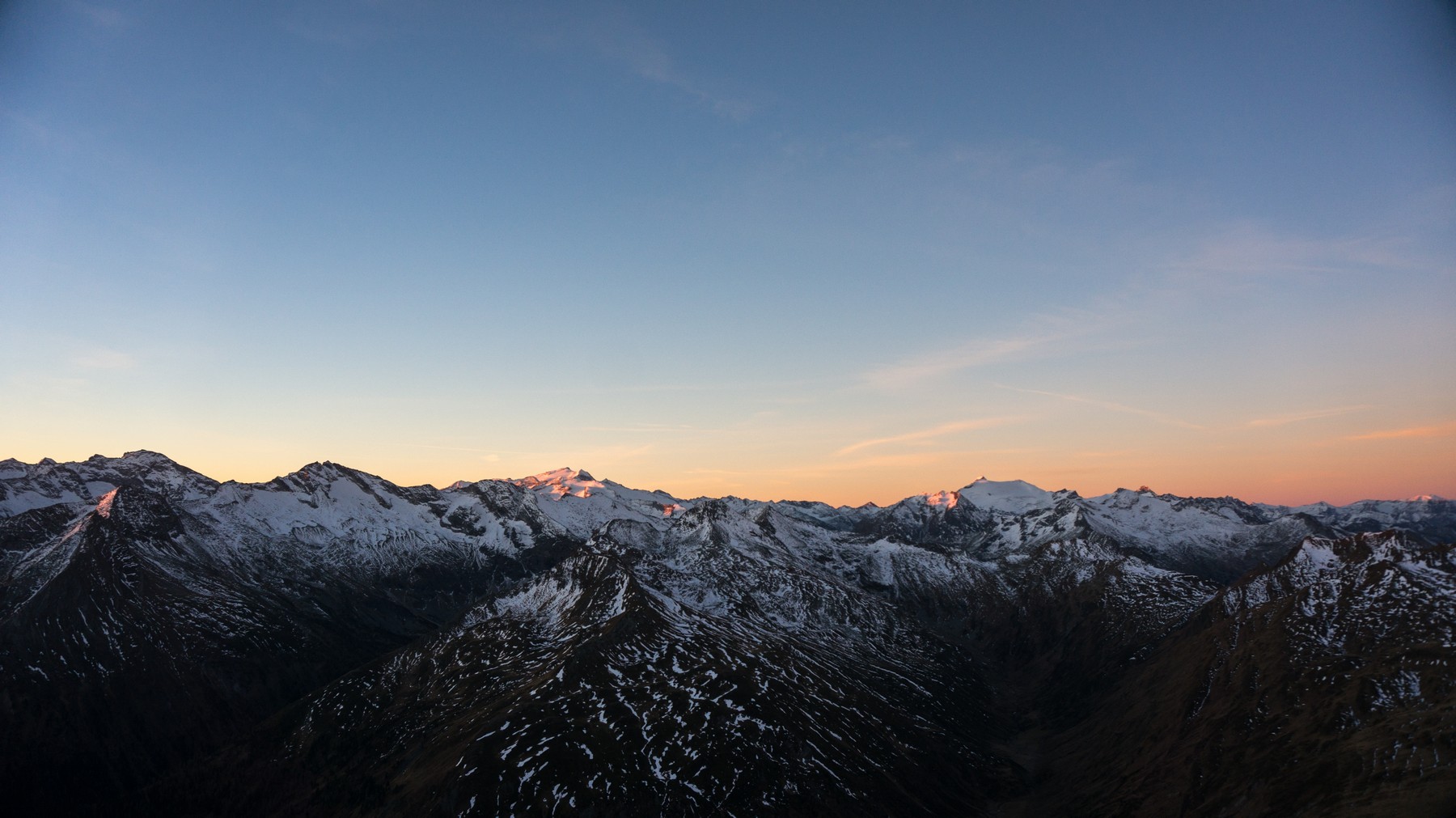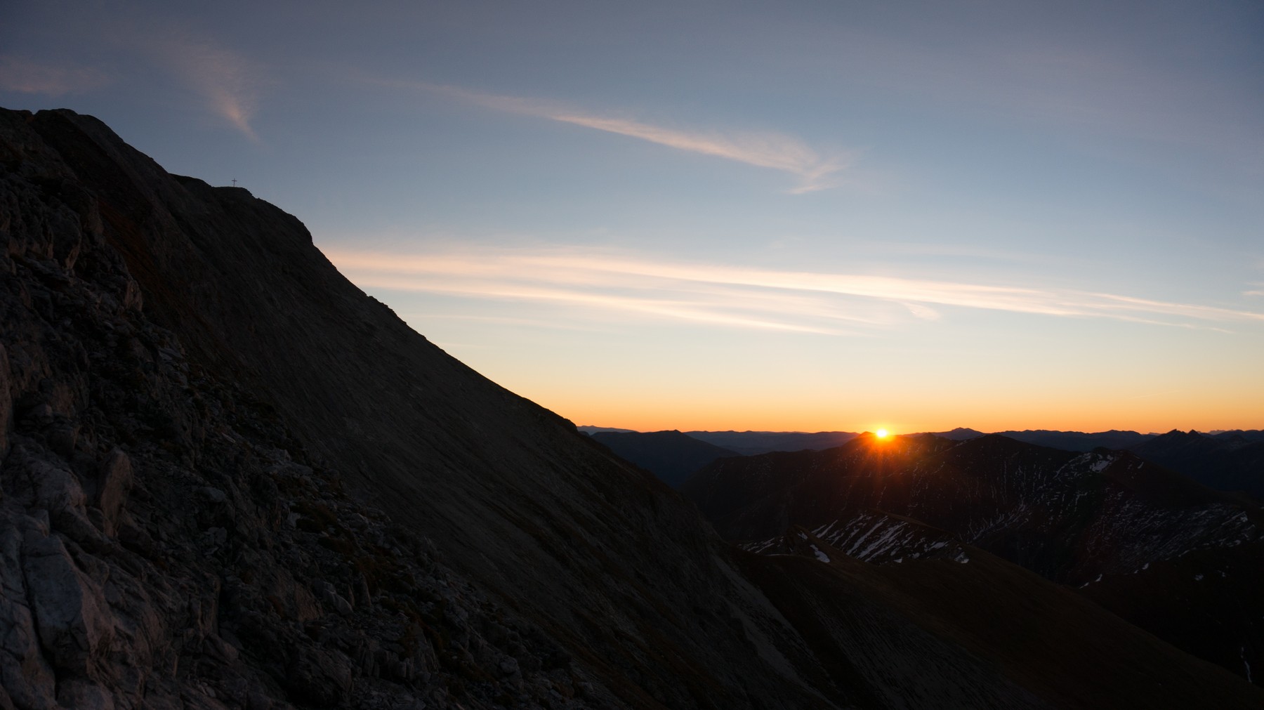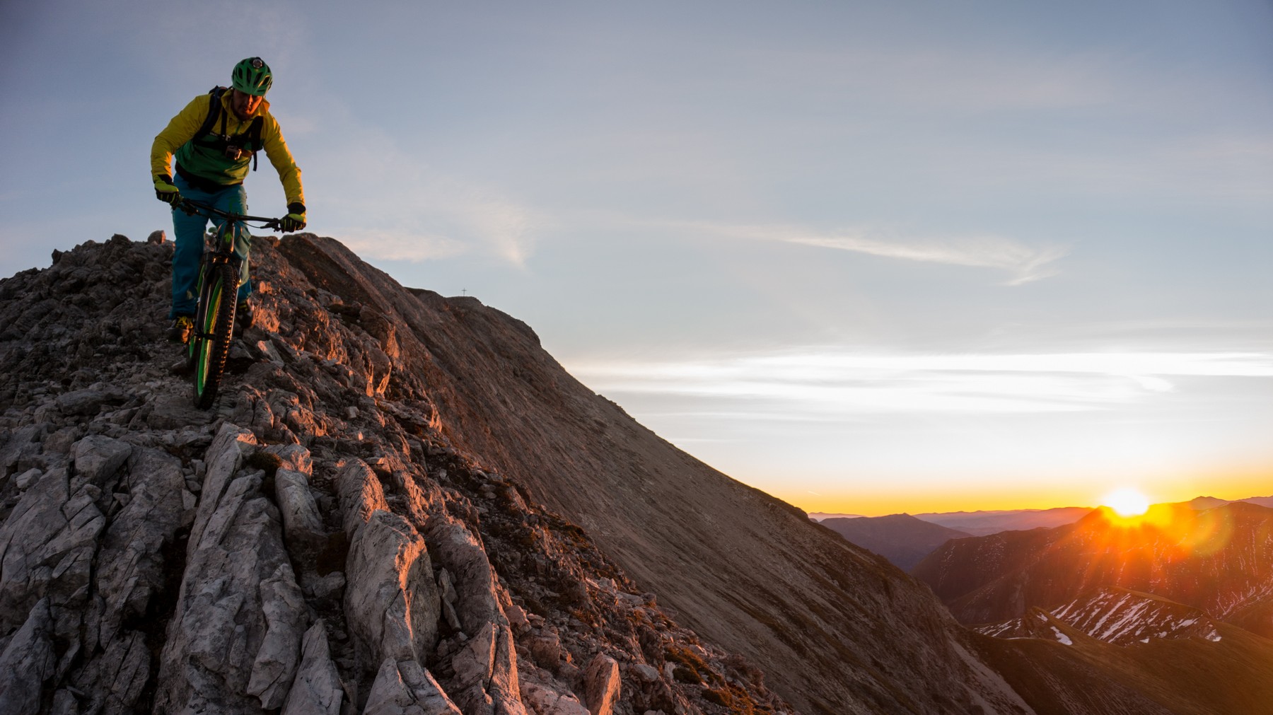 Noch ist es wirklich dunkel, auch der Horizont liefert noch keinen Hinweis auf die Sonne. Im Gegensatz zu gestern Abend wird kaum geratscht, denn wir brauchen die Energie. Langsam steigen wir auf, anfangs noch durch Wiesenhänge, die aber schon bald steindurchsetzter werden und schlussendlich einem alpinen, felsigen Grat weichen. Je heller es wird, umso ungläubiger werden die Blicke – das schaut nicht wirklich gut fahrbar aus, aber zumindest der Aufstieg macht Spaß. Gummisohlen auf Felsen: Mir gibt das etwas. Wir geben Gas, aber es wird immer klarer, dass wir heute nur Zweite am Gipfel sein werden, die Sonne ist schneller. Zum Glück, denn sie vertreibt die Kälte und tut vor allem den klammen Fingern gut. Sensationell, wie sie die Einsamkeit hier oben und das Bühnenbild um uns herum beleuchtet. Manche Gipfel sind schon angezuckert und leuchten jetzt rosa-orange, die Übrigen sind karg und strahlen tiefe Ruhe aus. Da ist nix mehr mit Speedbikebergsteigen. In diesem Szenario bewerkstelligen wir die letzten Meter und stehen dann ganz oben.