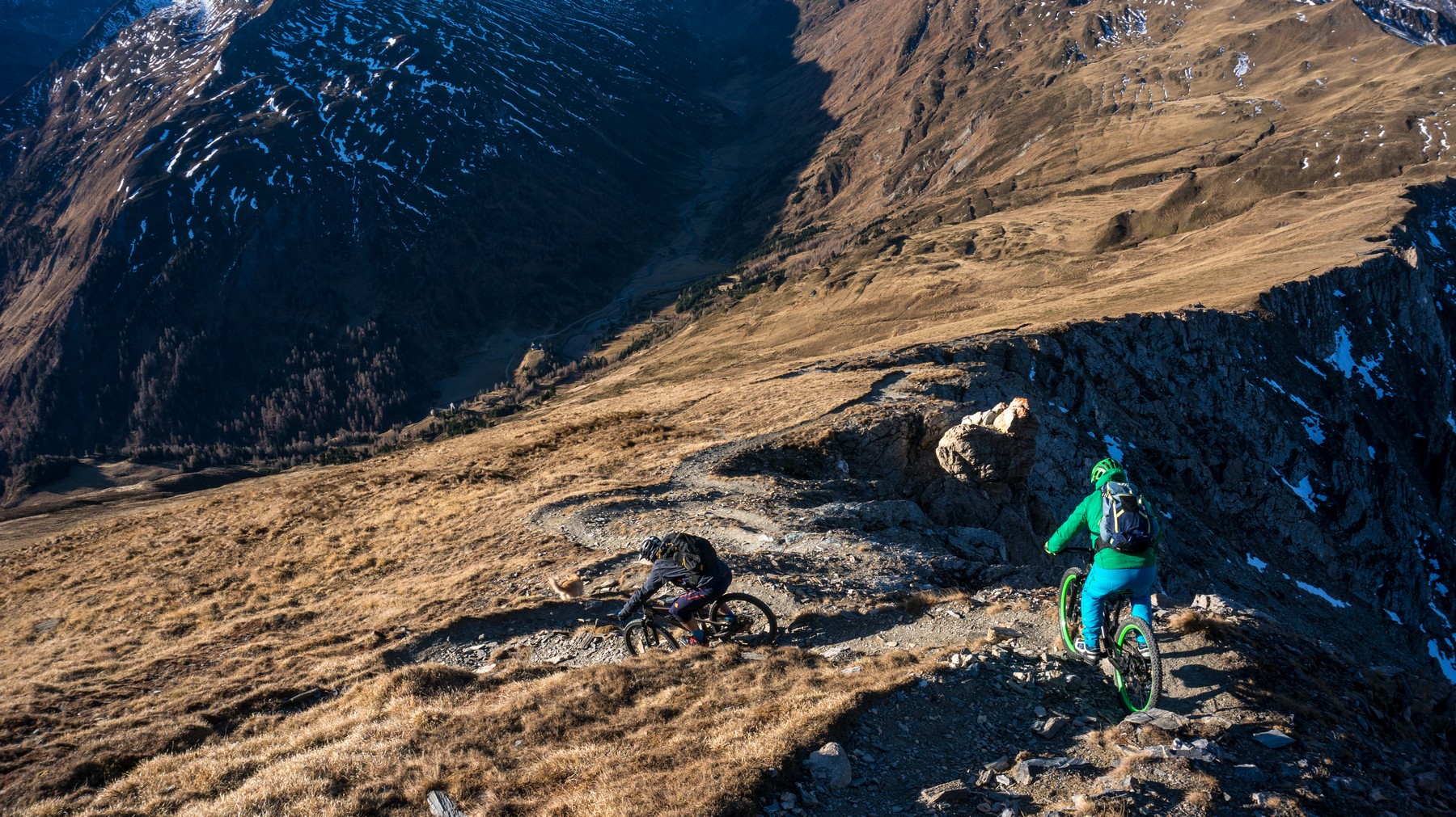 So in etwa müssen sich Wanderer fühlen, wenn sie einem Biker hochalpin begegnen. Die Stelle schaute aus der Position so derartig unfahrbar, so unwirklich aus … und dem gegenüber stand die Tatsache, dass man das gerade gefahren ist. Vermutlich gar nicht, weil man so ein toller Hecht ist, sondern wohl eher weil der Trailbaumeister eine wunderbare, versteckte Line reingelegt hat. Solche Momente sind mit das Genialste, das man beim Bikebergsteigen erleben kann, wenn das Bike nicht nur Fortbewegungsmittel ist, sondern mit dem Trail und dir verschmilzt. Und davon waren hier einige Stellen dabei. Der Berg hat uns richtig gefordert: Linienwahl, Feinfühligkeit, Mut. In dieser euphorisierten Stimmung erreichten wir unser ehemaliges Schlafquartier und bepackten uns wieder mit Schlafsack, Isomatte und Co.
