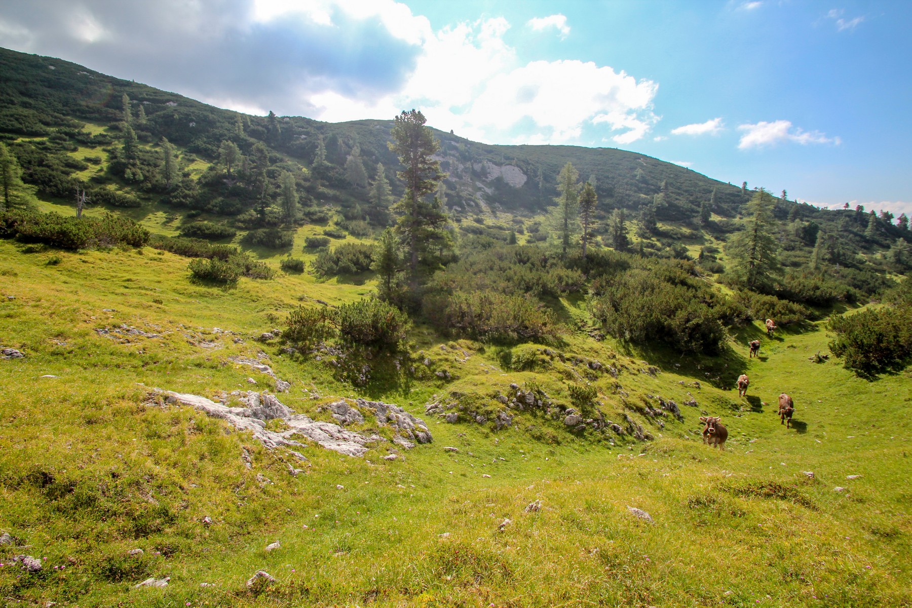 Nach ca. 20 min haben wir die Kühe abgehängt und schlagen uns alleine durch die Latschen. Wir glauben am richtigen Weg zu sein. Jojo hat sich beruhigt. Alles scheint wieder nach Plan zu laufen. Doch da – die Kühe sind wieder da! Und zwar in großen Massen und auf Tuchfühlung. Das Gelände und das Grünzeug erlauben uns, die Kühe hinter uns zu halten, ausreichend weit weg von Jojo jedenfalls. Da kommt uns das Grauen – es wird sich wohl nicht um die sagenumwobenen Killerkühe der Hochalpen handeln!?