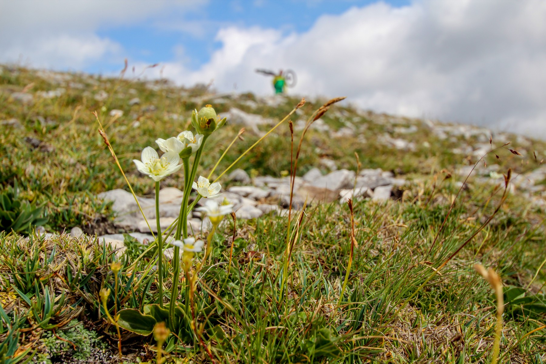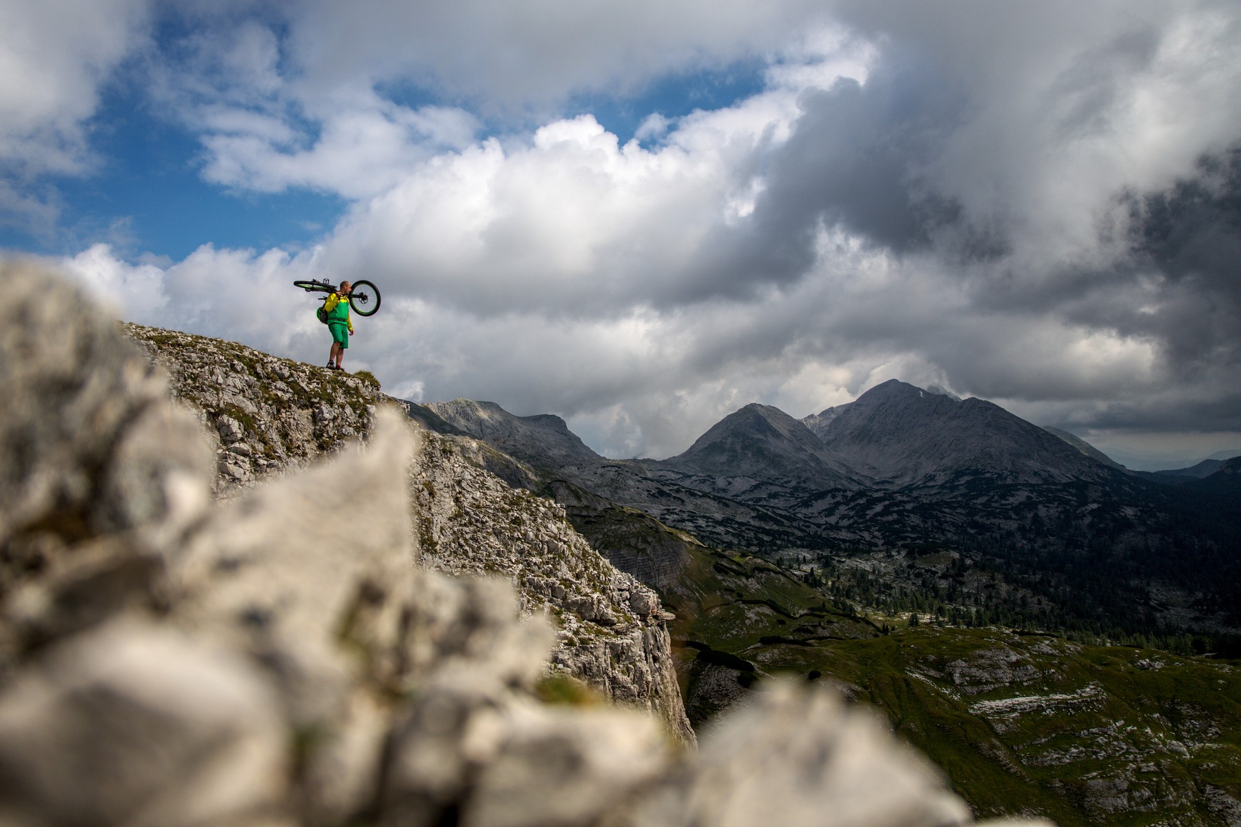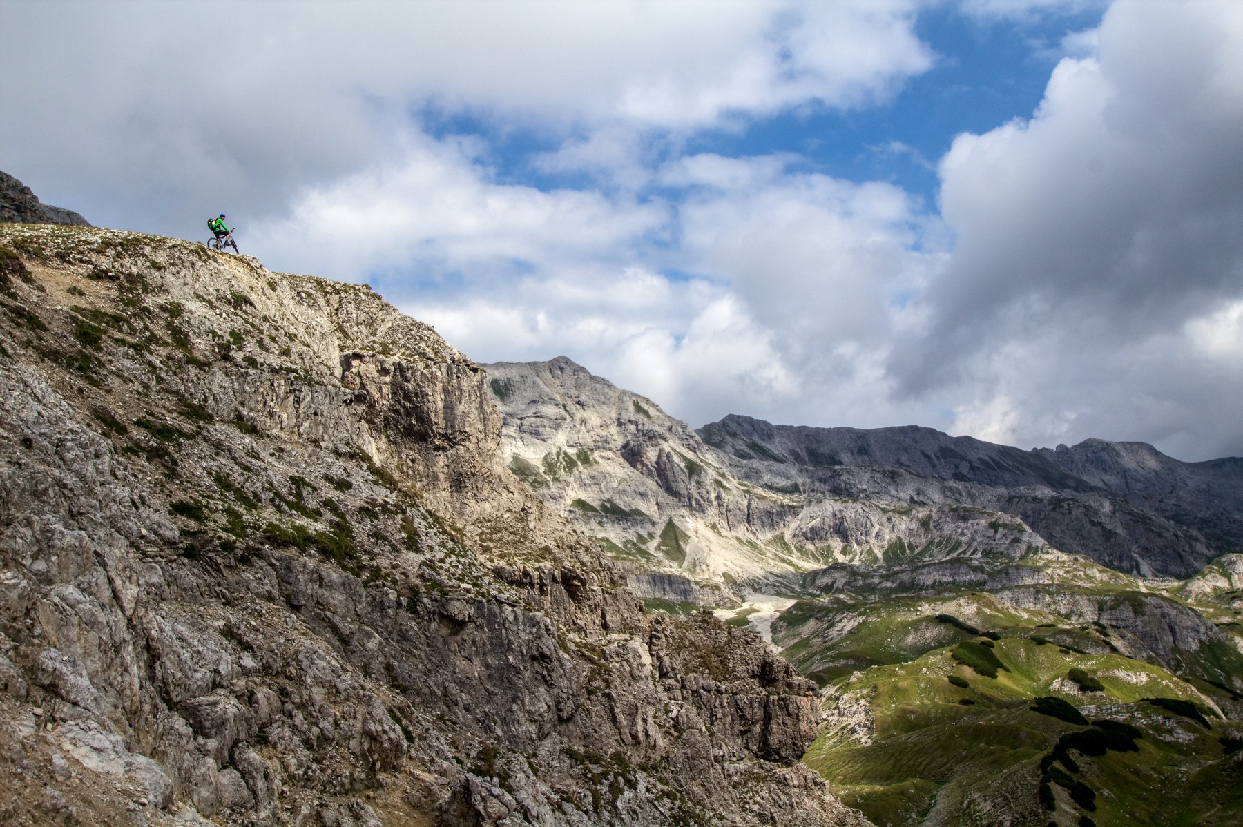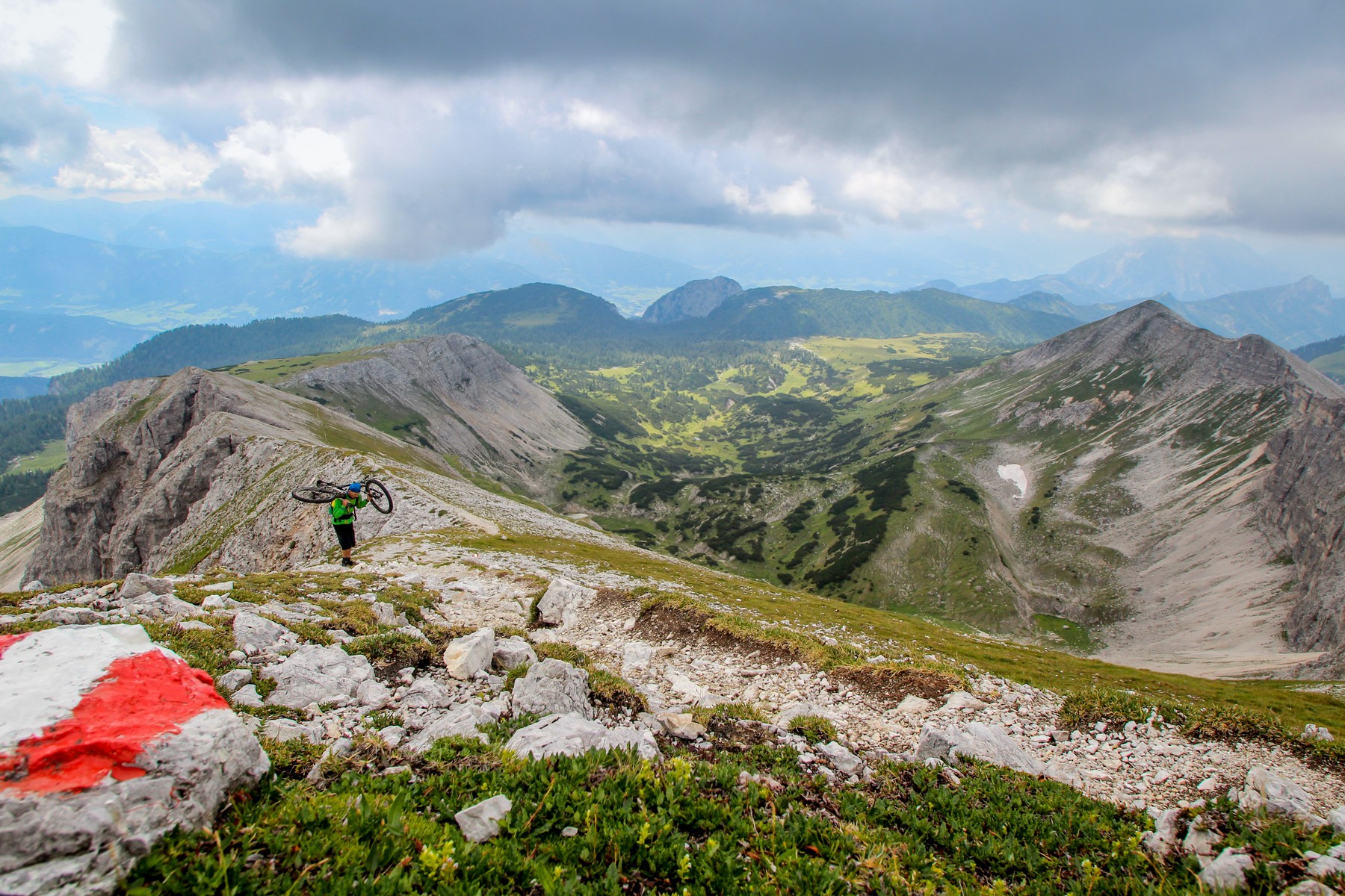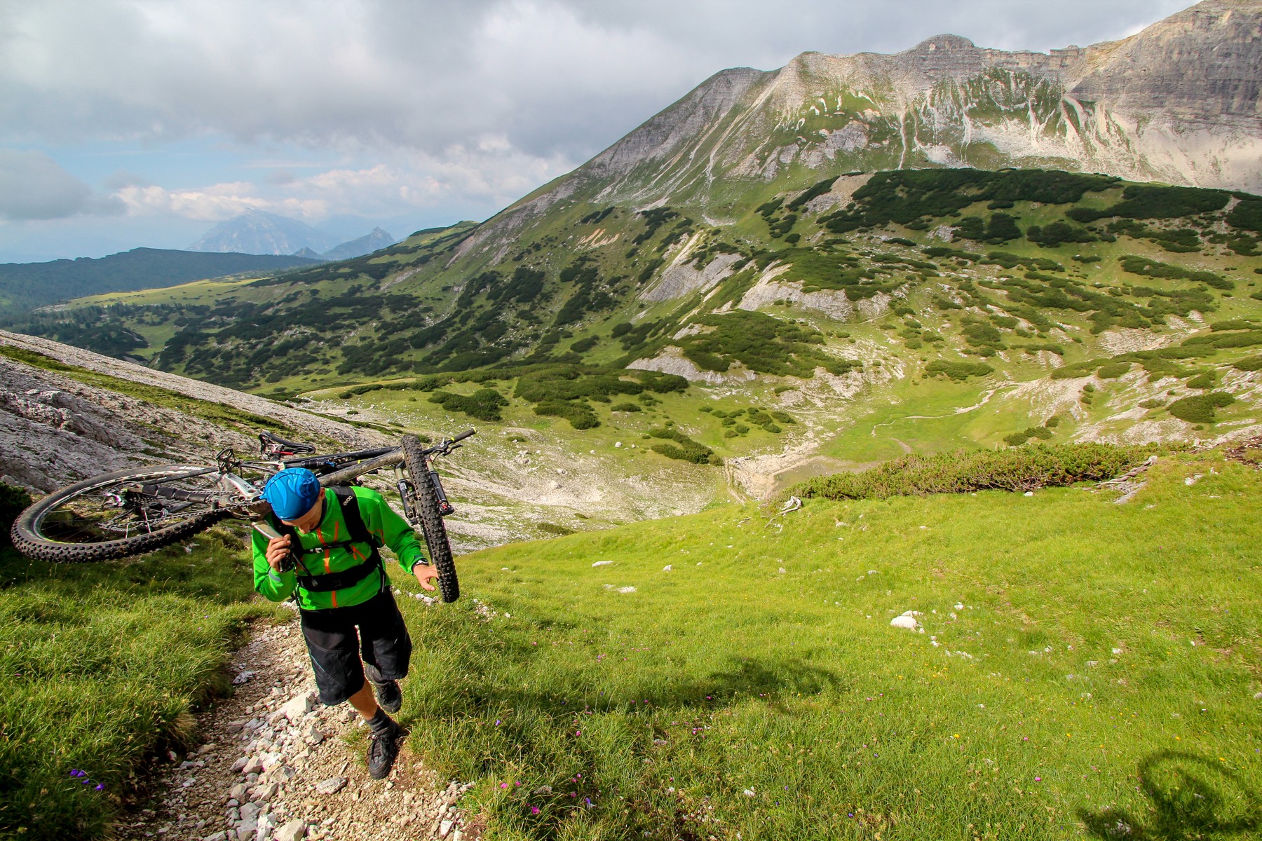 Aber alles der Reihe nach. Das erste Stück des Weges schaut fahrbar aus. Wir fahren. Flo M. bleibt auf der Hütte zurück. Nach wenigen Metern steigen wir überanstrengt ab. So ein Singletrail mit großen Felsblocks dazwischen hat‘s doch in sich. Aber Herwig kennt sich aus. Er weiß ganz genau wo wir sind und wo wir hin wollen. Zumindest so lange bis wir nach nahezu 15 Minuten an die vermeintlich sonnenklare Stelle kommen. Der Weg, der da sein sollte, dürfte erst vor kurzem ganz vom Erdboden rückstandslos verschluckt worden sein – auch hier konnten wir nicht wissen, dass Herwig eigentlich wirklich wusste wo wir sind und wo wir hin müssen.