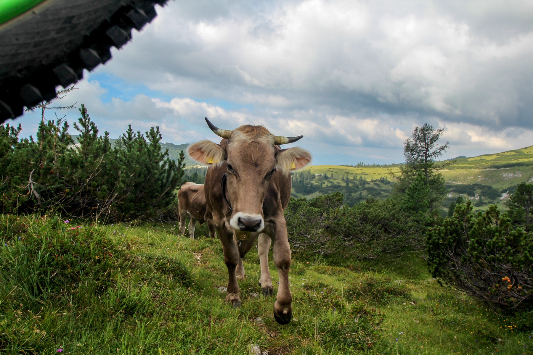 Wie durch Zufall kommen wir auf den Weg, den wir eigentlich nehmen wollten und erkennen unseren Fehler. Wir sind falsch abgebogen. Kurz vor den Kühen. 1h umsonst herumgeirrt. Uns wird klar: Killerkühe! Definitiv. Intelligente Wesen, die den Weg absichtlich verschleiern und so unschuldige Biketräger und vor allem unschuldige Hündinnen ins Verderben lockten. Nach insgesamt einer Stunde nervenaufreibender Treibjagd bleiben die K-Kühe wie angewurzelt stehen. Wir können uns das nur durch eine magische Wand erklären – ihre Gesichter schauen nämlich plötzlich ein bisschen wie nach einer Betäubungsspritze aus. Aufatmen. Wieder eine Tag überlebt. Also, zumindest bis jetzt. Der Rückweg führt uns woanders runter und so dürften wir wohl nicht durch die mysteriösen Killerkühe sterben. Heute.