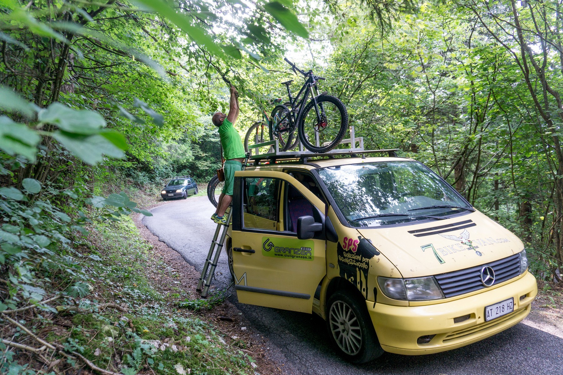 Die Anfahrt ins benachbarte südliche Friaul verlief wie üblich völlig unkompliziert. Wir trafen uns am Parkplatz einer lokalen Volksschule in Venzone. Alle waren fit und bereit für das bevorstehende Abenteuer. Auch der italienische Shuttle-Mann Gian Paolo von 7BikeVan, ein super spaßiger Typ mit seinem „top-modernen“ Bus, war schon da. Trotz unserer, nur für Bier-und-Pizza-bestellen ausreichenden Italienisch Kenntnisse, konnte wir nach etwas Smalltalk unsere Bikes verladen und Richtung Berg abfahren. Während der Shuttle Auffahrt hat Gian Paolo den „Auffahrtstrail“ eindrucksvoll ausgeputzt damit unsere Bikes auch sicher am Berg ankamen. Unglaublich was für Werkzeuge dieser Mann in dem Bus versteckt hatte. Druide Miraculix hätte sich bestimmt gefreut.