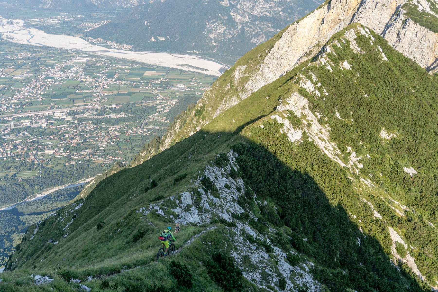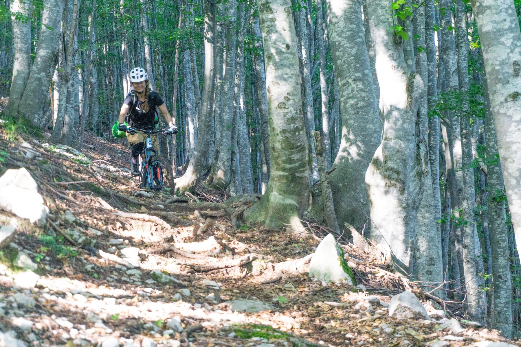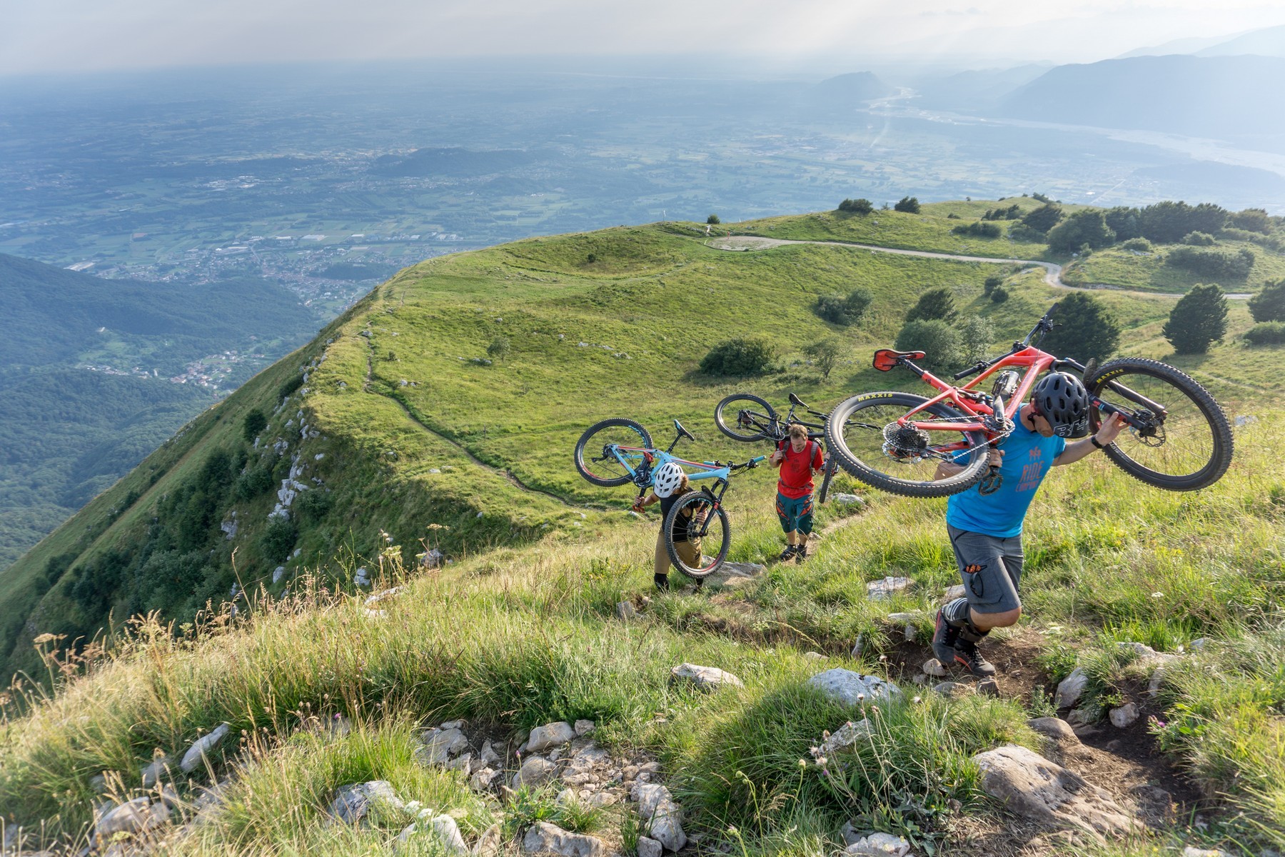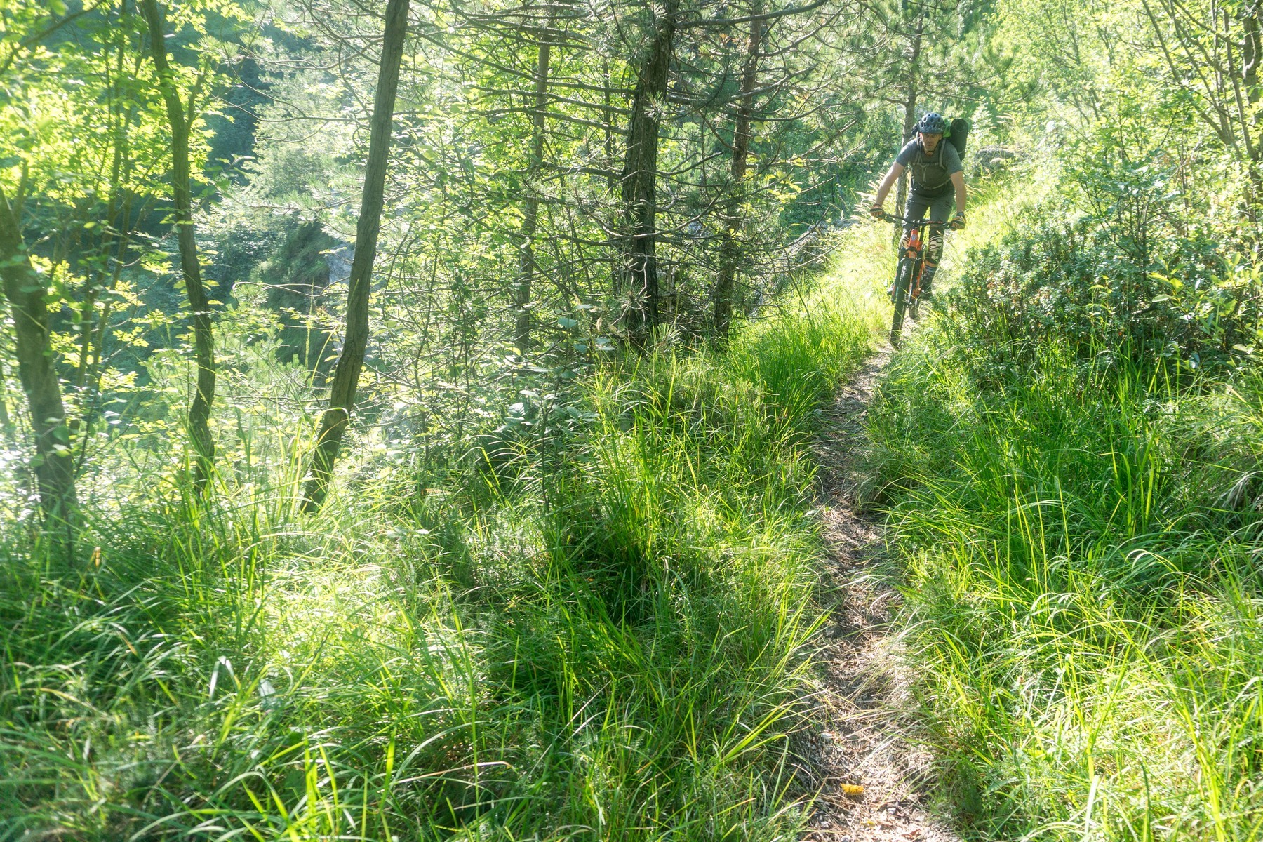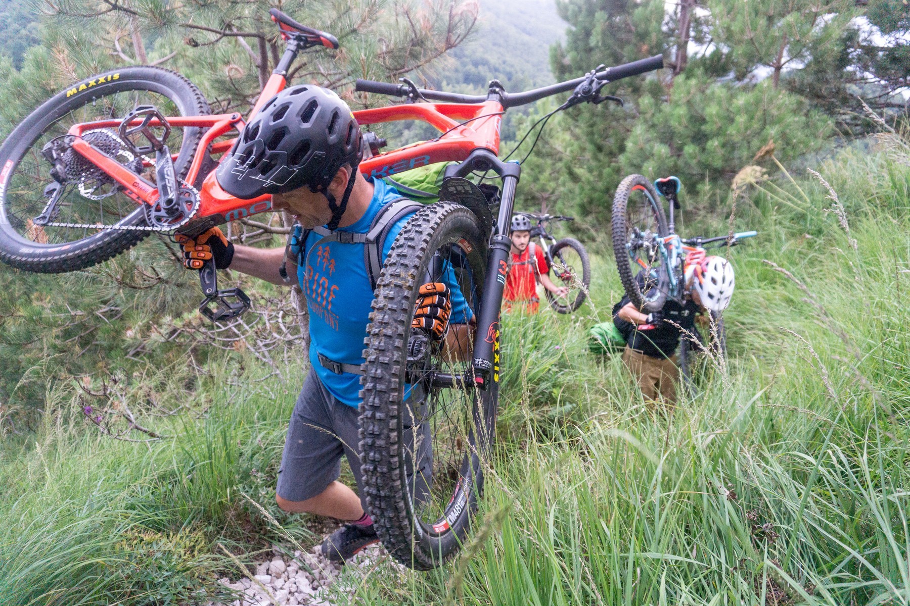 Die erste 400 Höhenmeter Abfahrt machte schon Lust auf mehr. Ein nicht zu steiler Steig gesäumt mit mittelgroßen Steinen. Uns ging das Grinsen gar nicht mehr aus dem Gesicht oder wie einer der Teilnehmer es formulierte: „Genau so etwas find ich super!“ Zum Schluss sind wir dann im Kuhfladenslalom (Kuhmist im Profil kommt bei Tragepassagen gar nicht gut!) das letzte Stück zurück zu unserer „zufälligen“ Homebase in einem Agriturismo geradelt.