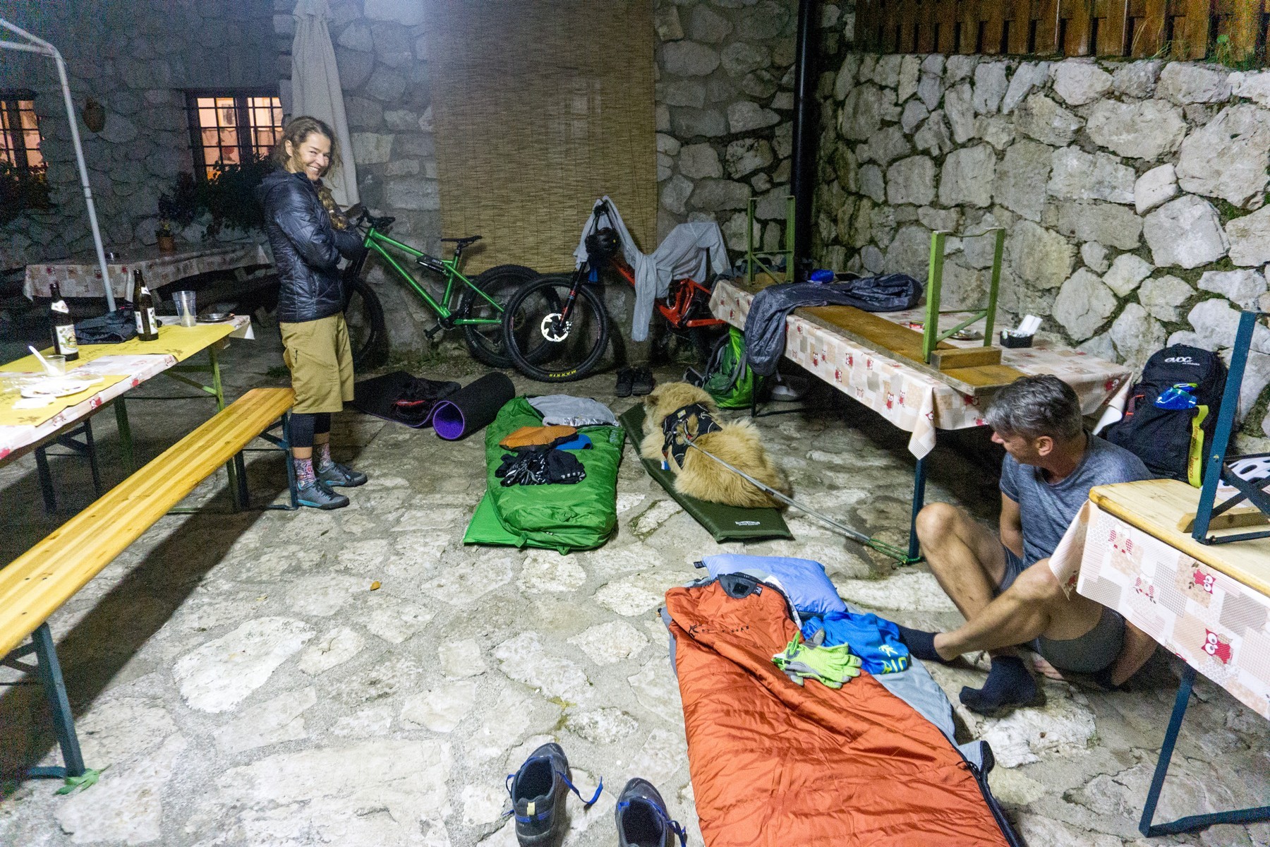 Nach einem freundlichen Gespräch durften wir beim Agriturismo auf der Terrasse unter Dach biwakieren. Schlafgelegenheit gesichert. Check. Dann bestellten wir Gnocchi, Dessert und isotonische Getränke. Mjamm, wer hätte mit so viel Komfort gerechnet bei dieser Tour. Das Glas war definitiv halb voll. Mit vollem Magen ging es dann ab ins vermeintlich komfortable Biwak.