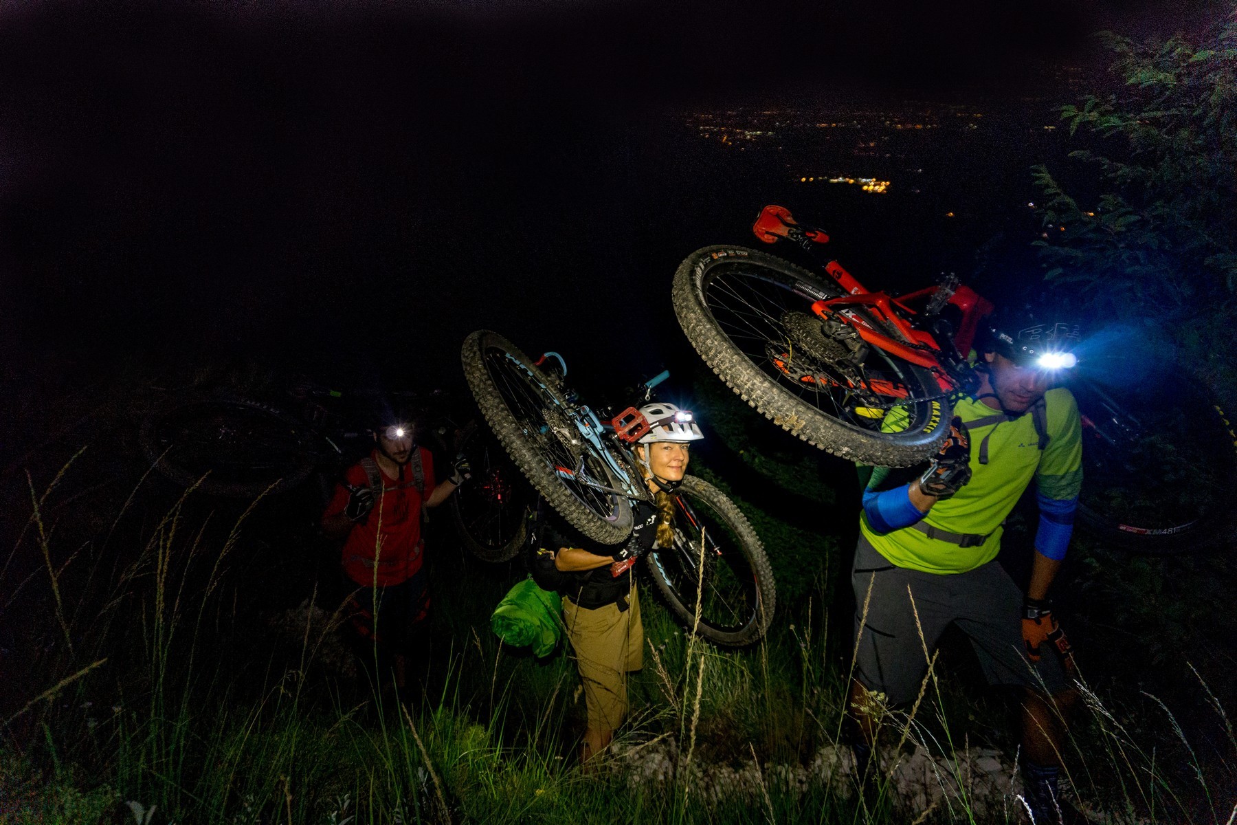 Um ca. 19:30 Uhr sind wir dann zu unserem Hauptgipfel aufgebrochen. „Leutlan wir müssen los, wenn wir nicht zu spät am Gipfel sein wollen.“ Schritt 1: Reifen von Kuhfladen reinigen! Check! Unsere Bikes schiebend den Berg hoch zu bringen war nach 5 Minuten beendet. Ab dann war nur mehr schultern und tragen angesagt. „Der Aufstieg ist aber schon etwas steil!“ Egal, weiter.