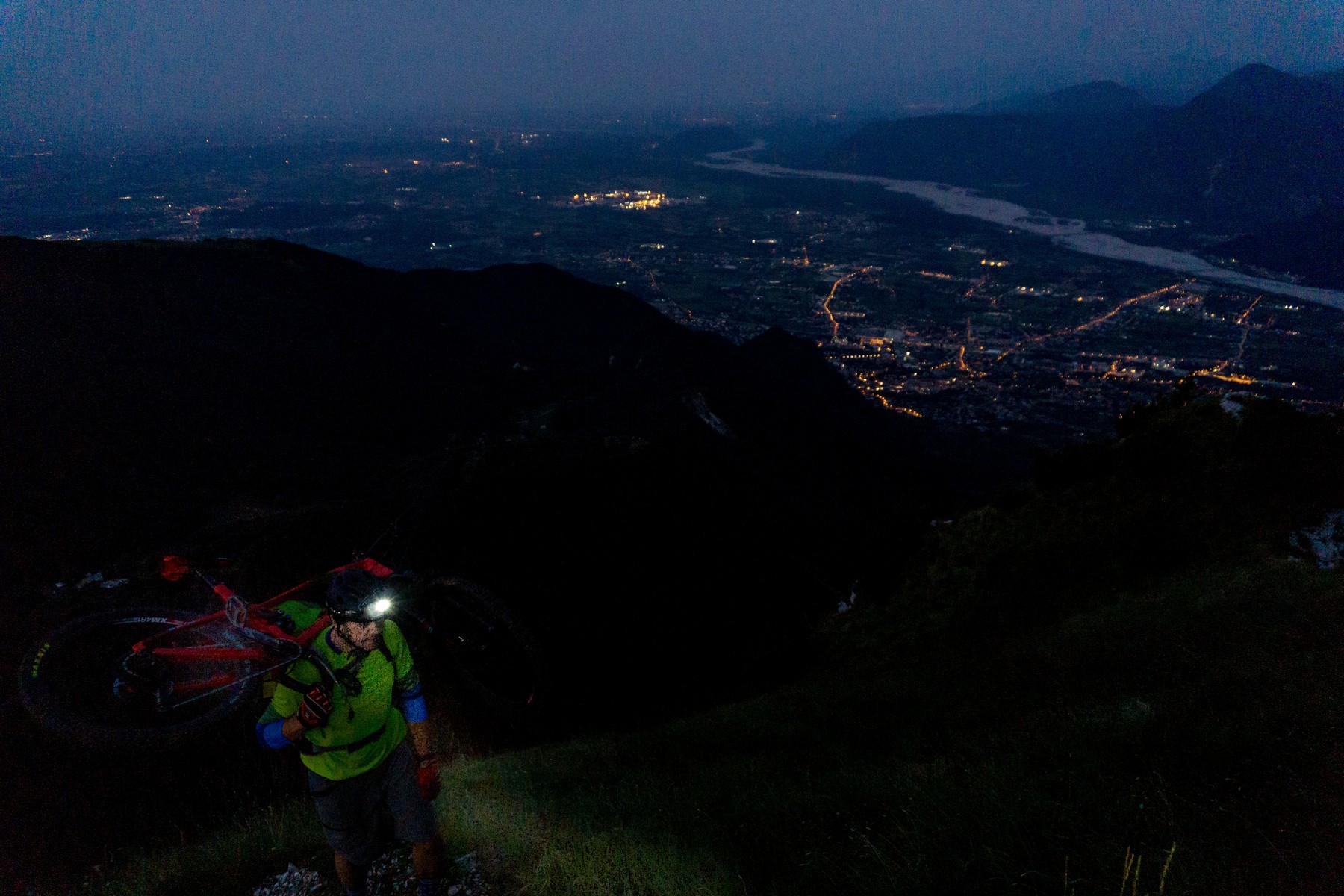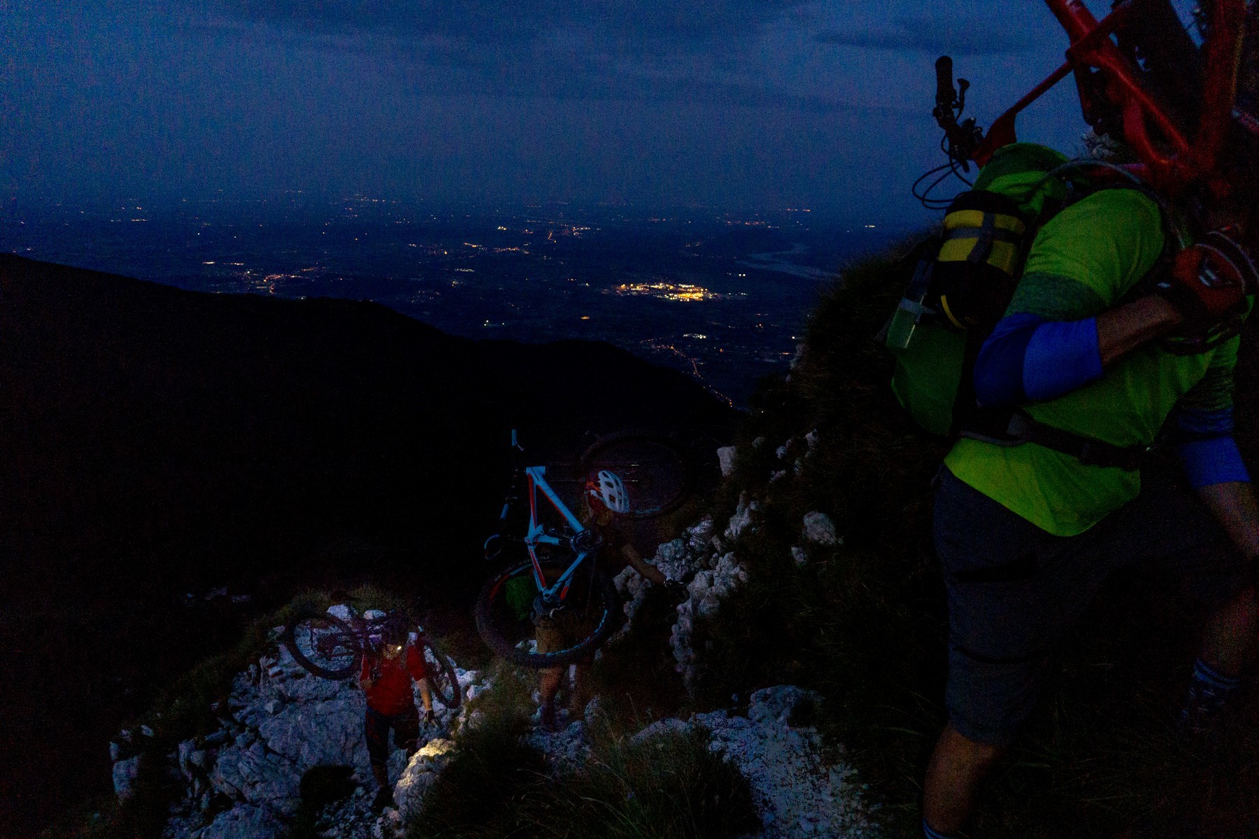 Auf ca. 1.350 hm war dann eine kleine Rast möglich. Schon über einige Zeit hinweg haben wir alle mit Besorgnis die Wolken beobachtet. Es wurde immer dunkler. „Hat wer Handy-Empfang und kann das Wetterradar checken?“ Es sah nicht gut aus und es wurde auch immer dunkler. Im gesamten Friaul gab es nur eine Gewitterzelle mit ca. 1 km Durchmesser, welche sich genau über unsren Berg anbahnte. Donald Duck kann über so viel Pech sicher ein Lied schreiben, ich war sehr verwundert über so viel Pech. Die Entscheidung umzukehren und beim Agriturismo zu biwakieren, war sehr schnell und eindeutig vom Guide getroffen. Also ging es 350 Tiefenmeter wieder kletternd und manchmal fahrend in der Dunkelheit hinunter. Wir kamen um ca. 21:00 gerade noch rechtzeitig an bevor die Küche geschlossen wurde im Agriturismo. Juhuuu. Wir waren froh und die Belegschaft und Wanderer der Hütte übrigens auch, welche unser Vorhaben mitbekommen hatten! Eine Minute nach unserer Ankunft setzte der Regen für rund eine Stunde ein. Böse kleine Gewitterzelle!