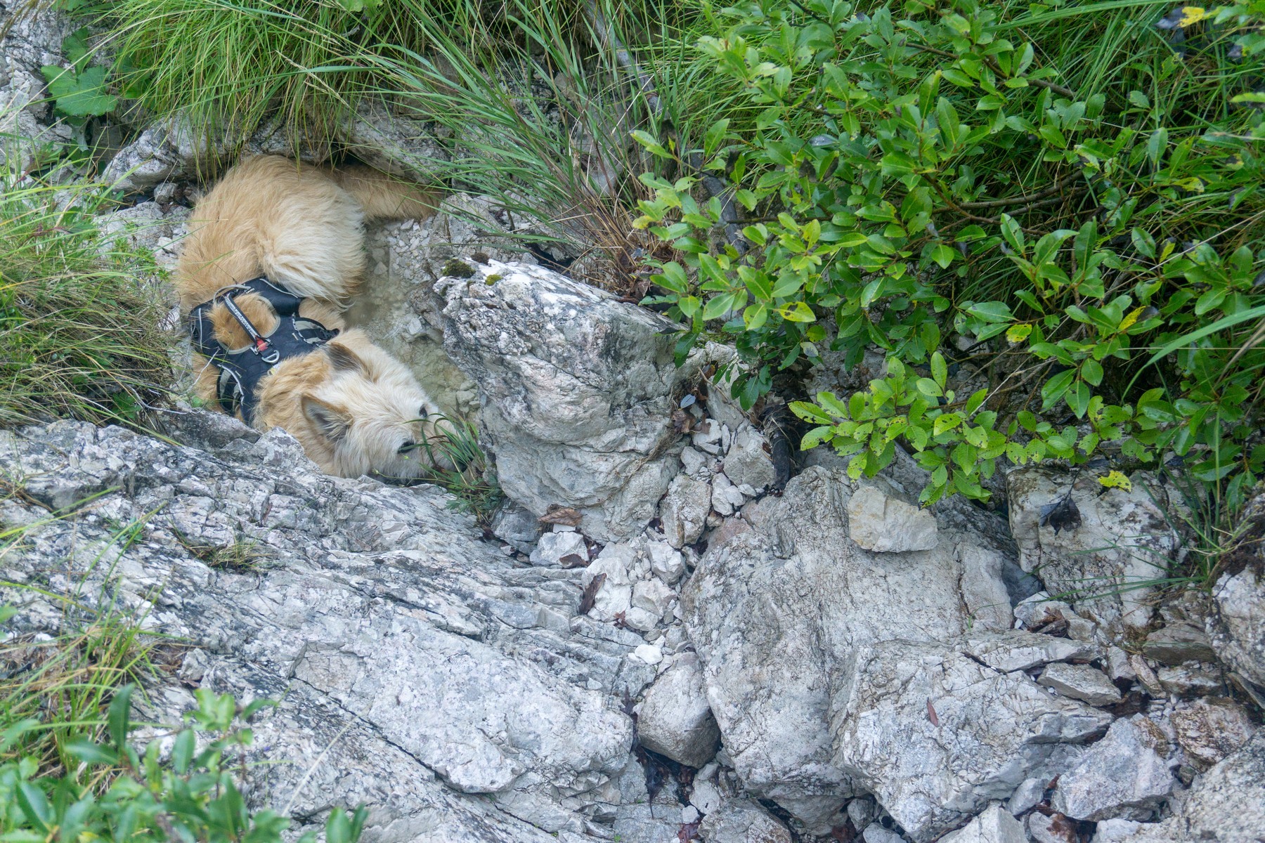 Unser Traildog Jojo war fix und fertig. Ein freundlicher Italiener gab ihr Wasser und brachte JoJo mit dem Auto ins Tal während wir die finale 200hm Asphalt Speed Strecke zu unserem Parkplatz mit kühlenden Fahrtwind ausrollten.