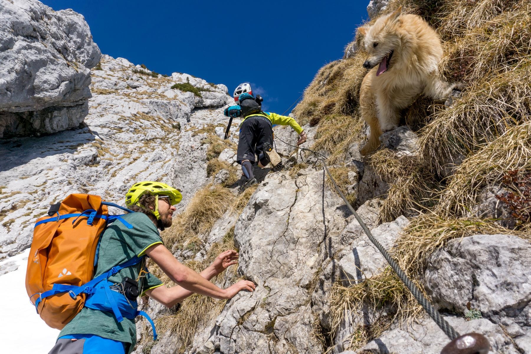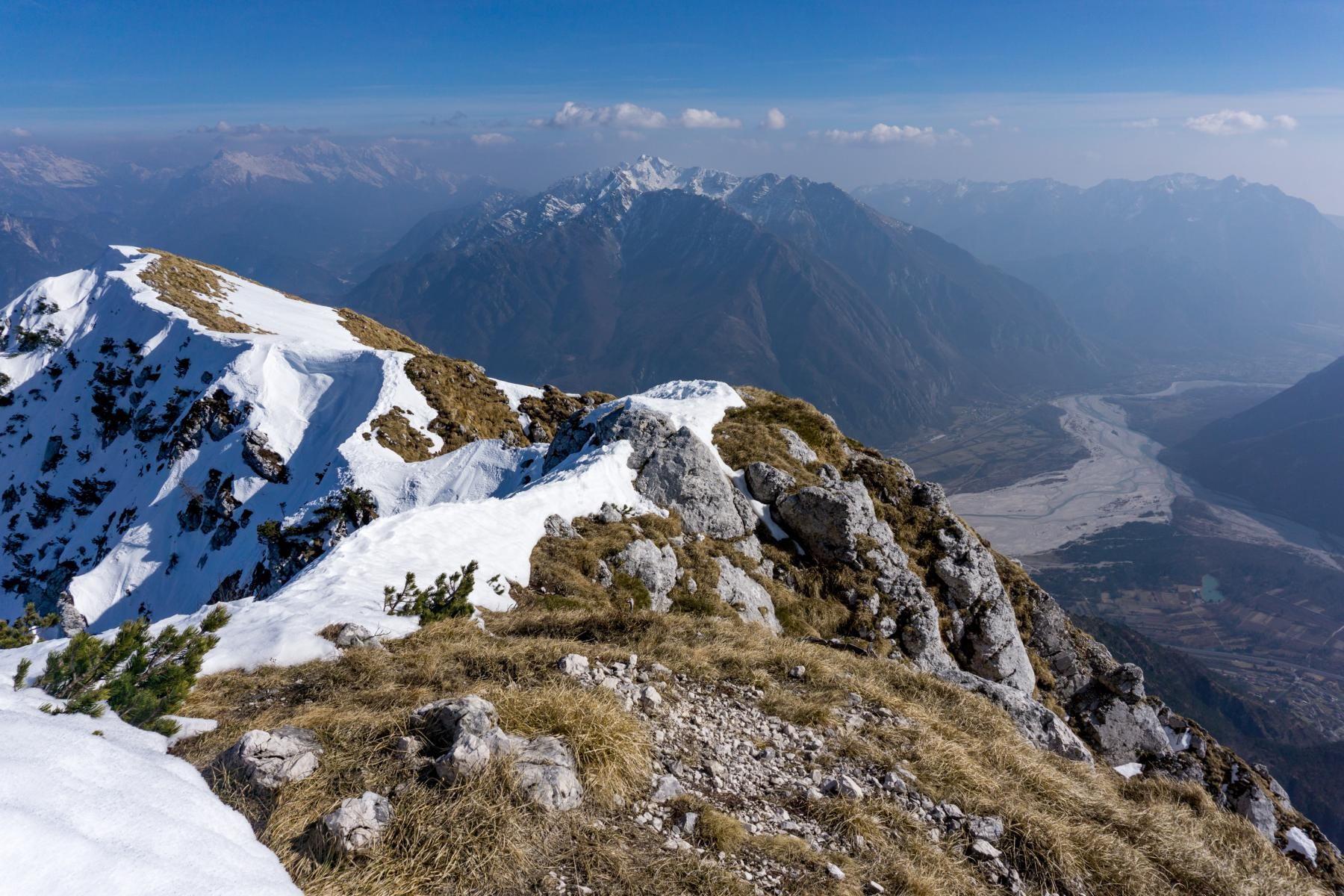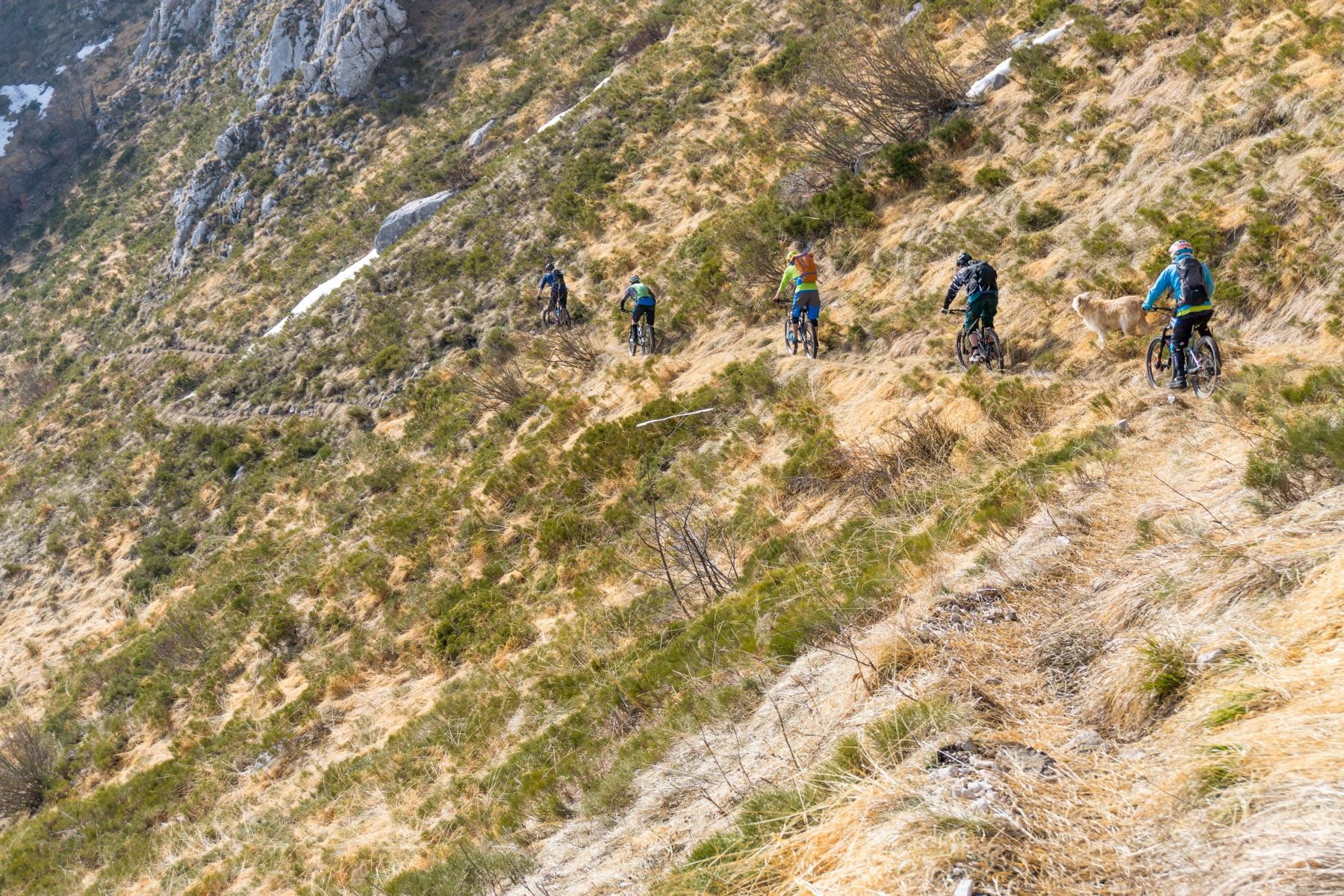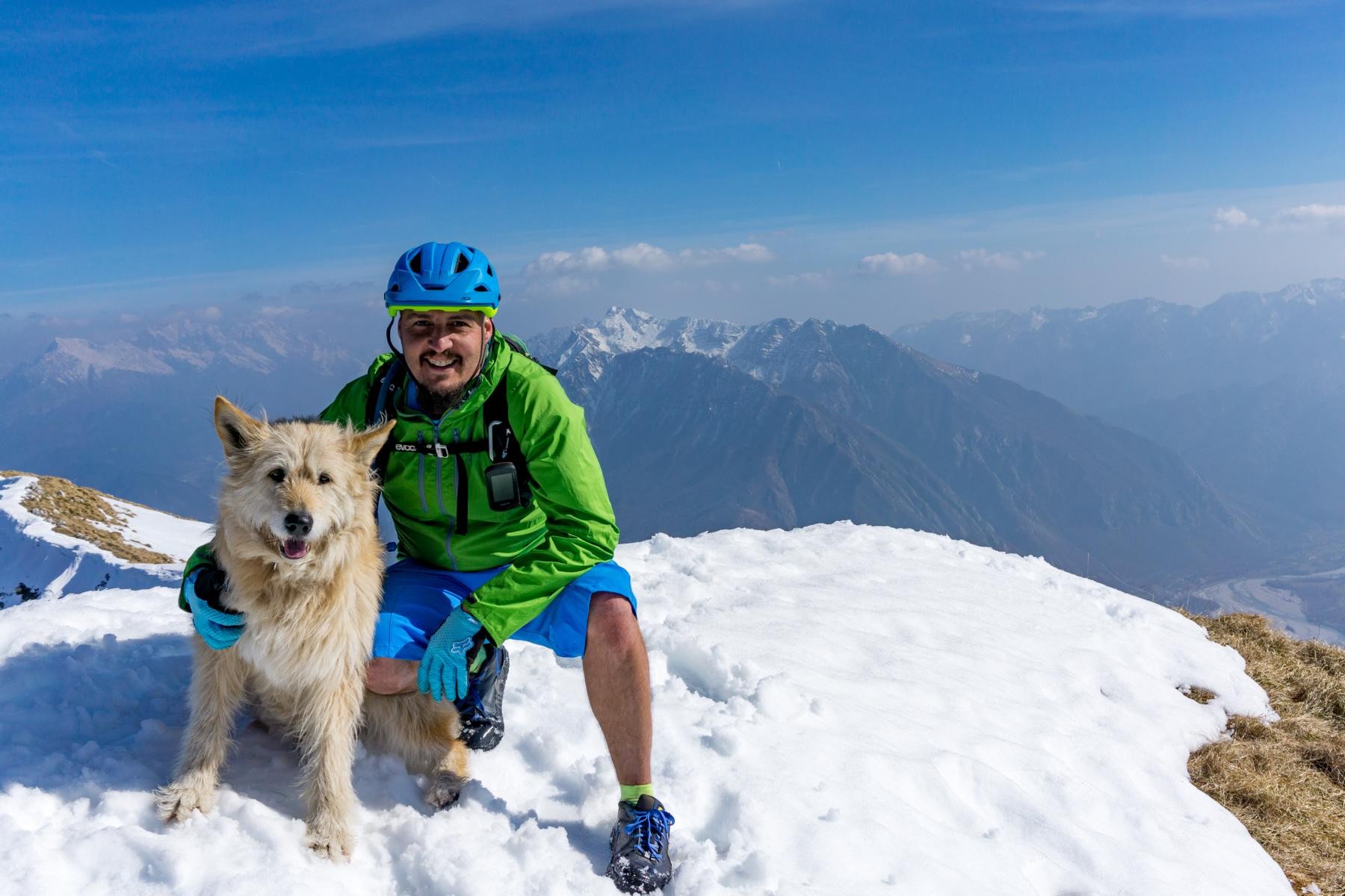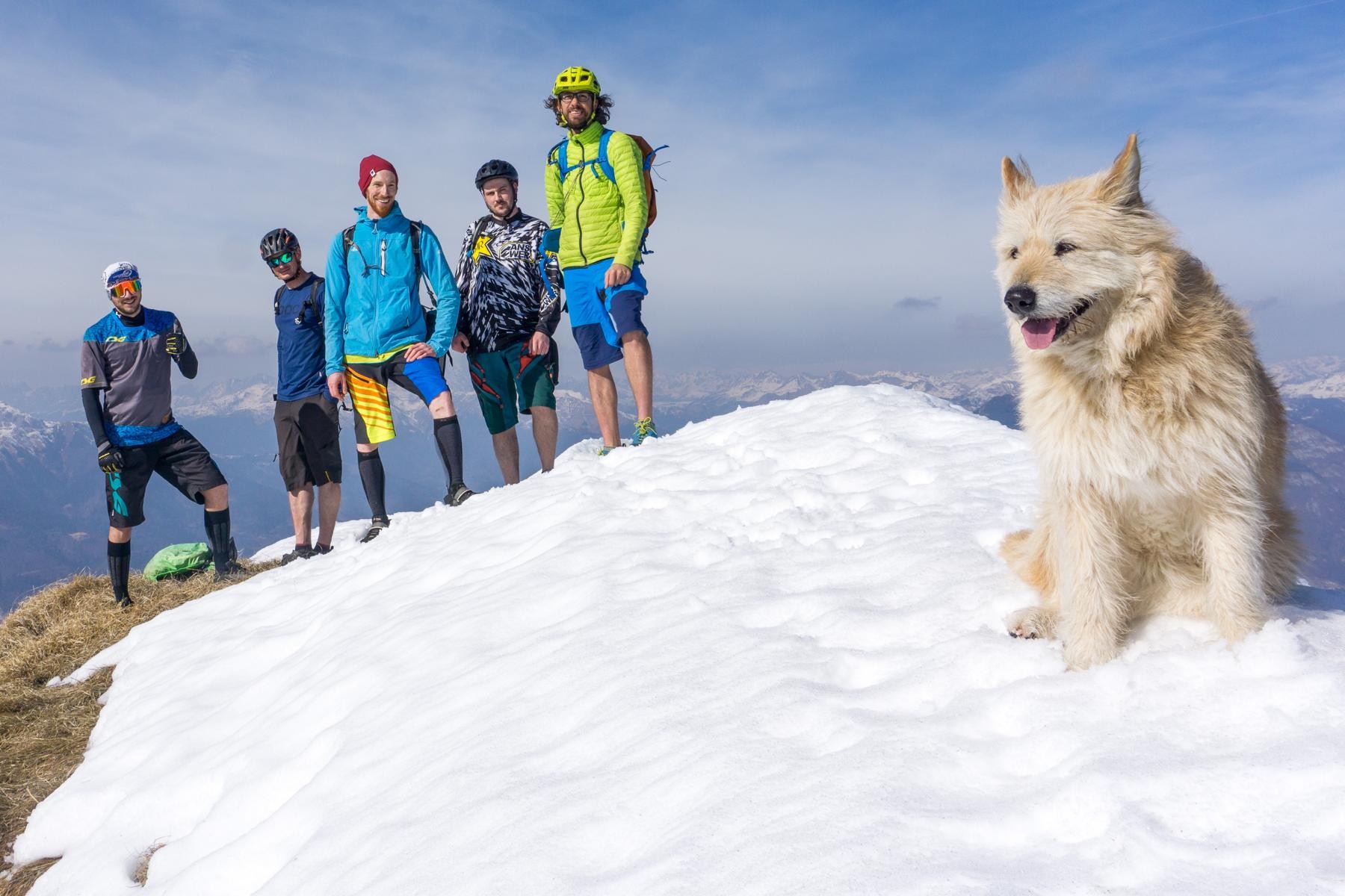 Die Steilheit des Geländes und die in Italien eher selten anzutreffende, durchgehende Seilsicherung legten uns nahe ein Raddepot am Berg unter dem Gipfel anzulegen. Multisportaffin, wie wir nun mal sind, wurde der restliche Berg kletternd bezwungen und kurz darauf standen wir schon auf einem Nebengipfel unseres eigentlichen Zieles. Am Gipfel erinnerten uns die Schneefelder und entgegenkommende Wanderer mit Steigeisen an den Schuhen dann doch wieder daran, dass wir den meteorologischen Winter eigentlich erst seit drei Tagen hinter uns gelassen hatten. Dieser Berg entpuppte sich als alpines Abenteuer mit Langzeiterinnerung. Zwei erfahrene konditionsstarke Alpinisten aus unserer Gruppe machten sich auf und erklommen auch noch den zweiten Gipfel.