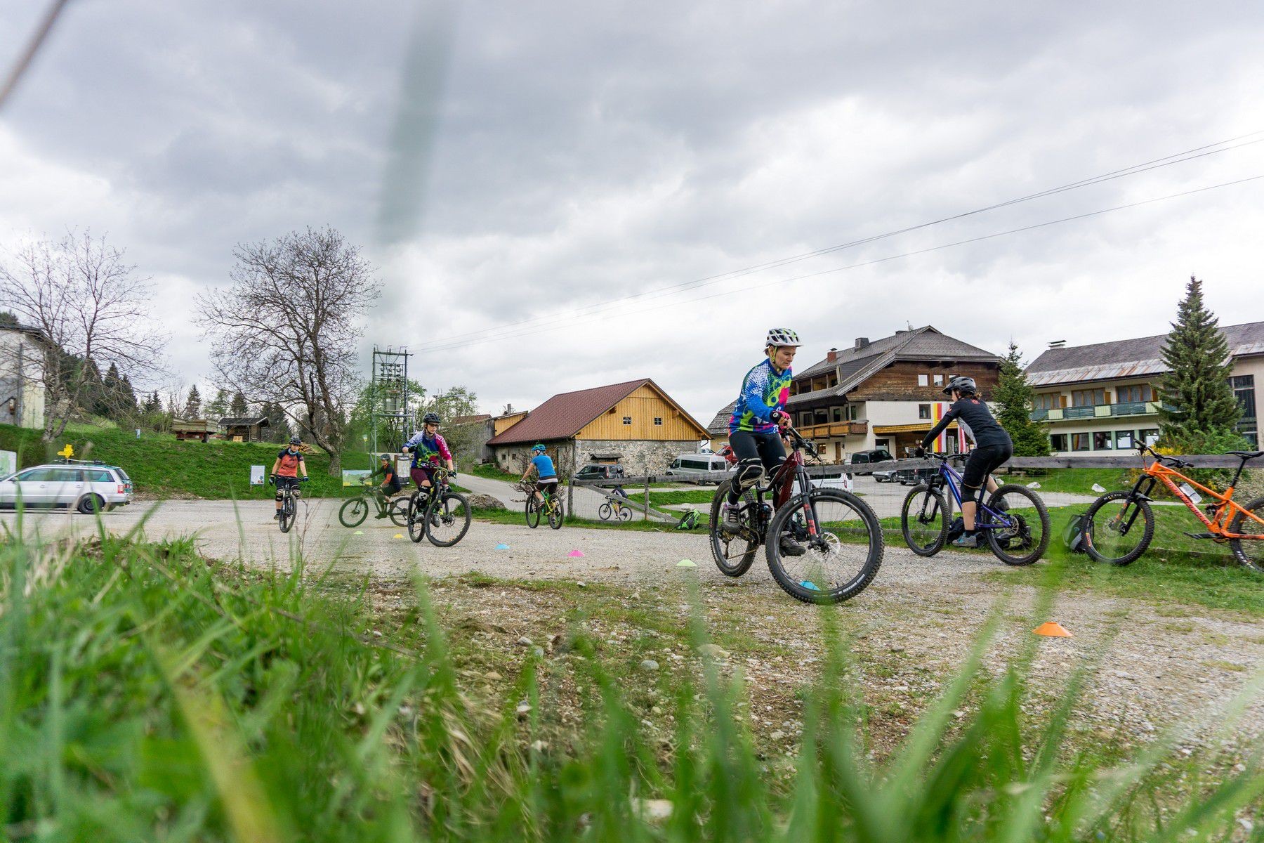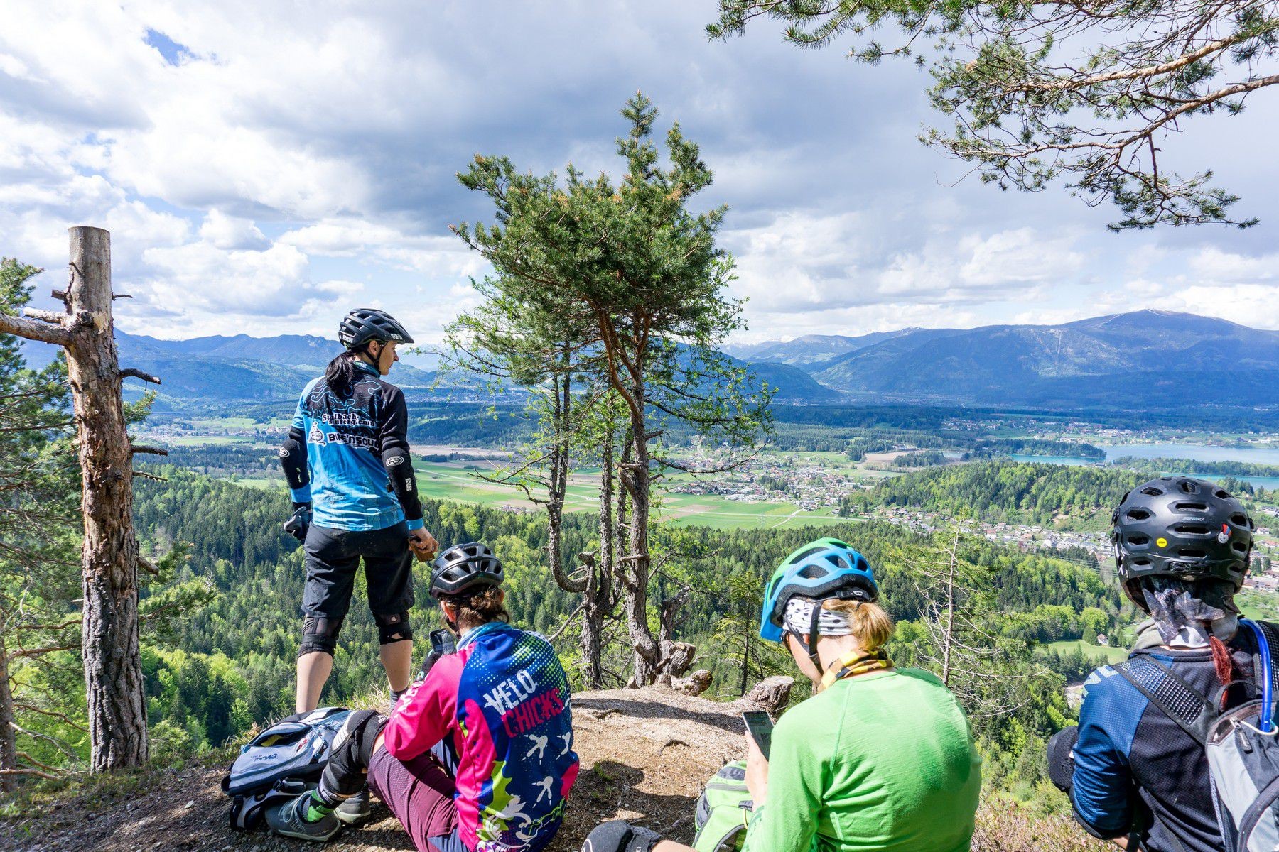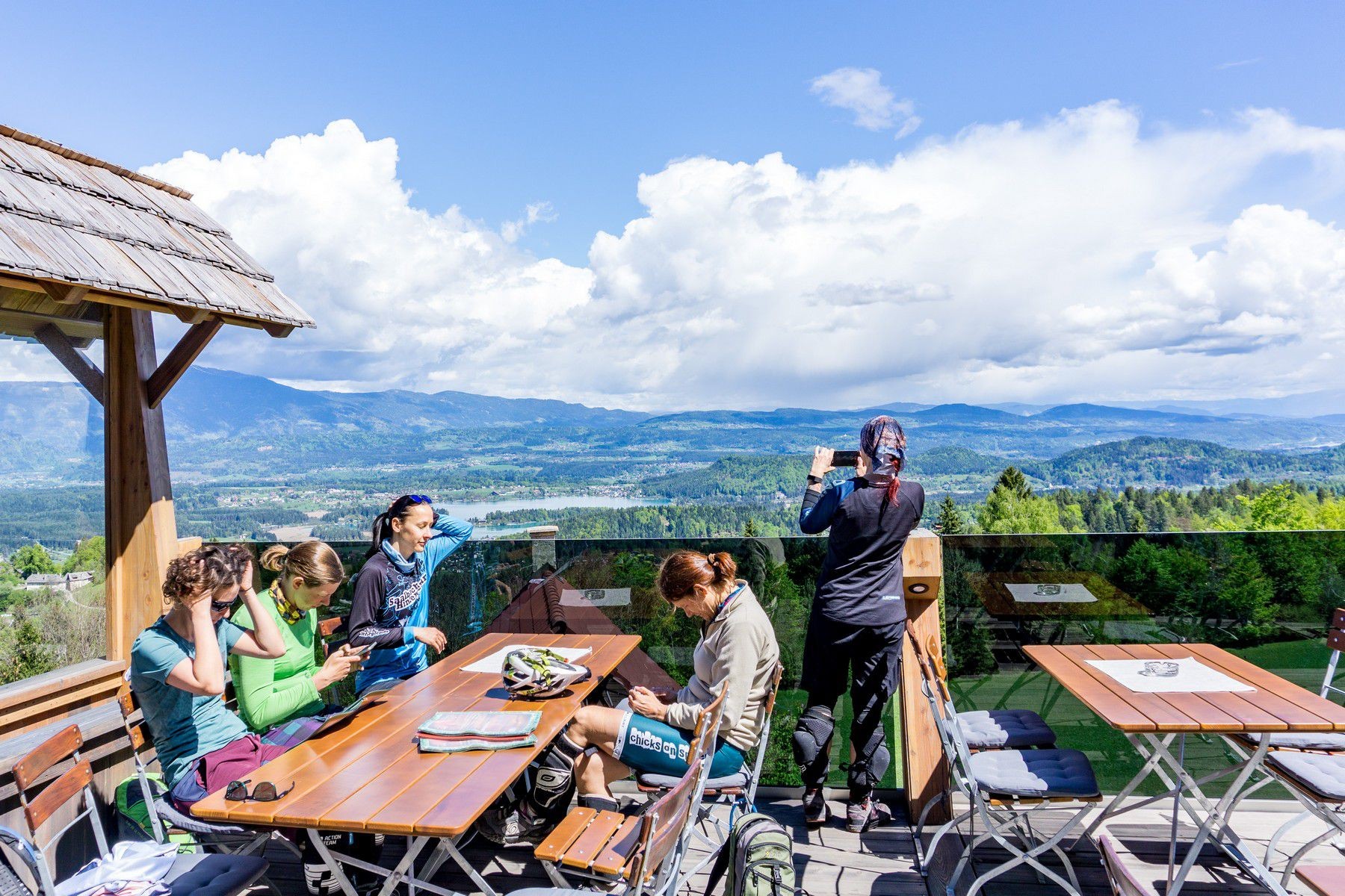 Die Bikerinnen und der Guide waren diesmal privilegiert und durften nach Absprache mit unserem Partner der Tourismusregion Villach-Faaker See-Ossiachersee bzw. Lake.bike, der Mountainbikemarke dieser Region, die neu gebauten und jungfräulichen Flowtrails auf über 1000 Meter Seehöhe befahren. Weiterer Bonus: Diese Trails liegen direkt neben dem beliebten Gasthof Baumgartnerhof mit Übernachtungszimmern und Tiefblick auf den berühmten Faaker See. Feinste Kulinarik durften die Bikerinnen gleich am Tag 2 zu Mittag auf der Terrasse vom Baumgartnerhof genießen.