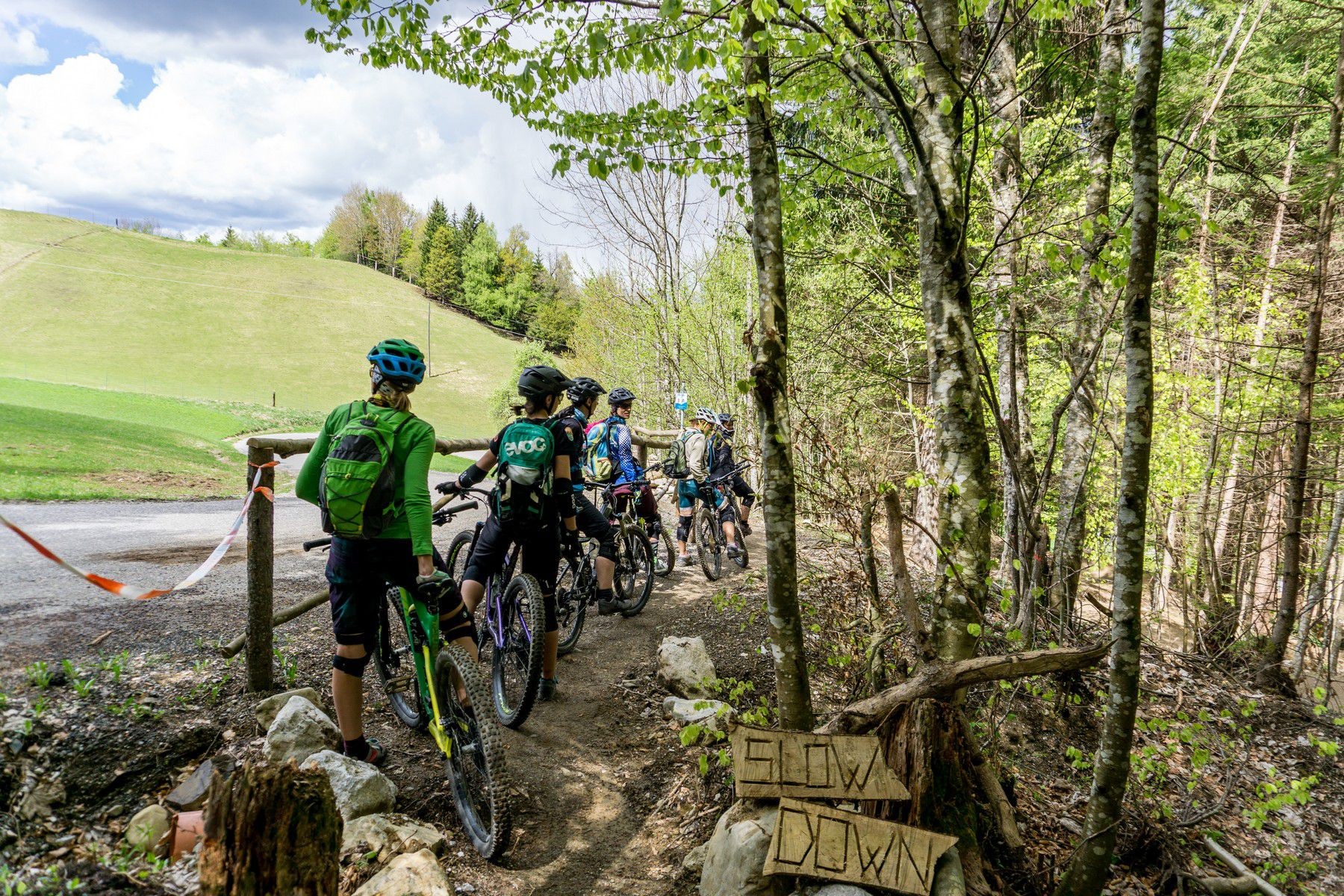 Nach dem Lernerfolg beim Trockentraining ging es dann auf die gebauten Trails „Flowgartner“ und „Lowgartner“ zur Praxisanwendung, um mehr Fahrspaß und Sicherheit zu finden. Speed, verschiedene Kurventechniken, die richten Bremspunkte, Wellen „schlucken“ oder springen standen am Programm.