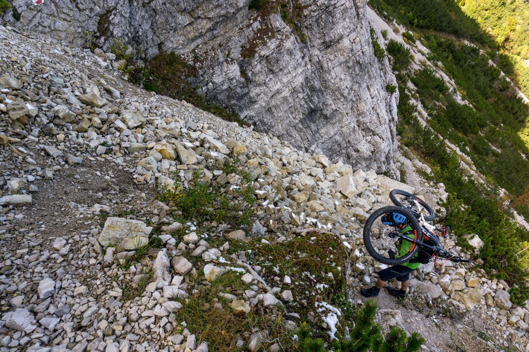Wenn Schieben auch nicht mehr möglich ist, muss das Bike geschultert und getragen werden. Dies funktioniert mit allen E-Fullys sehr gut, da der Schwerpunkt sehr tief liegt und die Bikes auf den Schultern sehr gut ausbalanciert sind. Schlussendlich bleibt es jedoch ein Kraftakt.