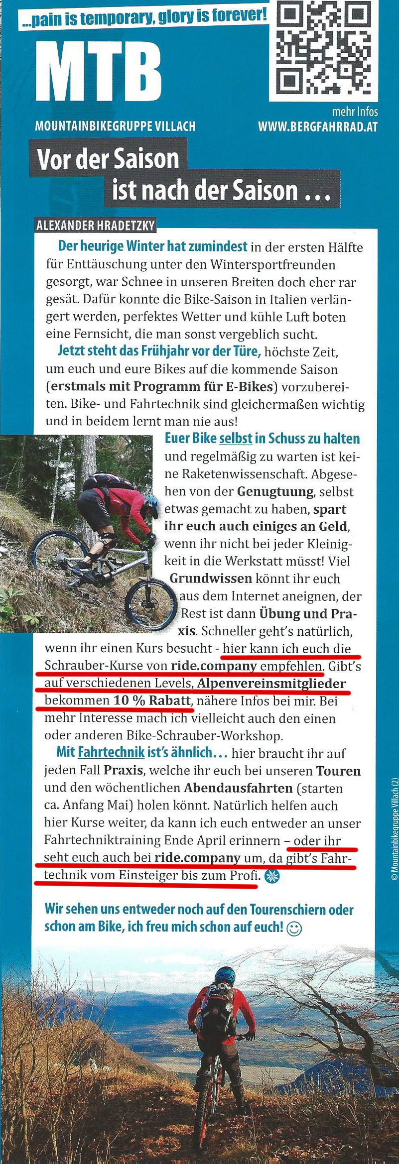 Alpenvereinsmitglieder der Sektion Villach bekommen auf alle RIDE.company Angebote einen Rabatt von 10%.